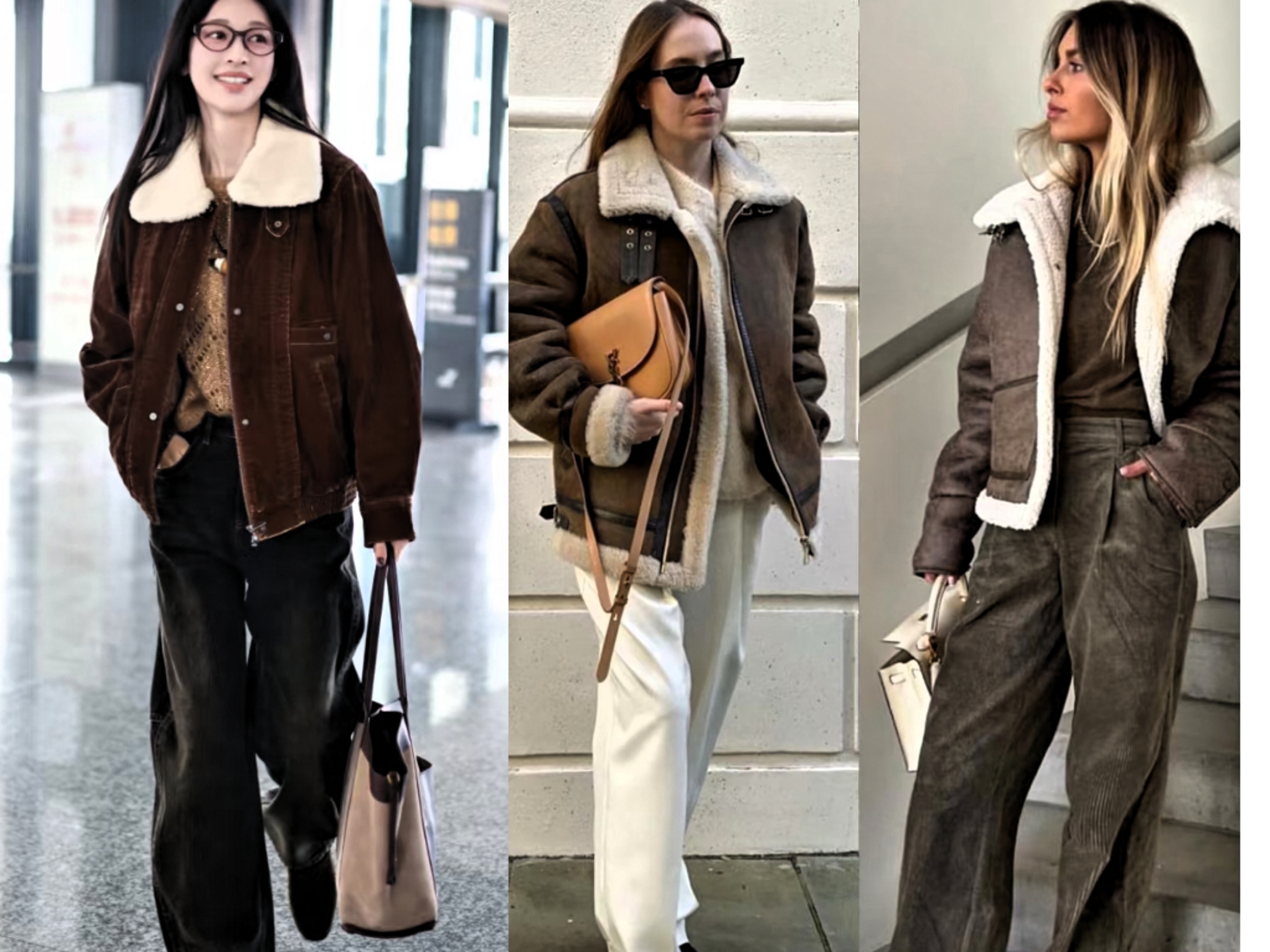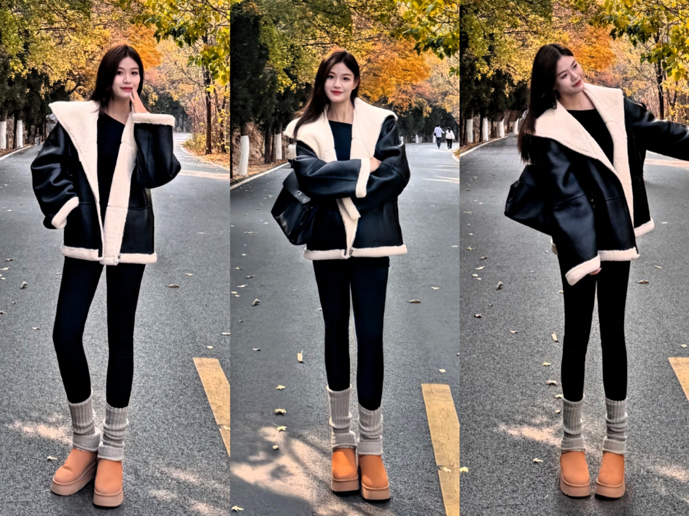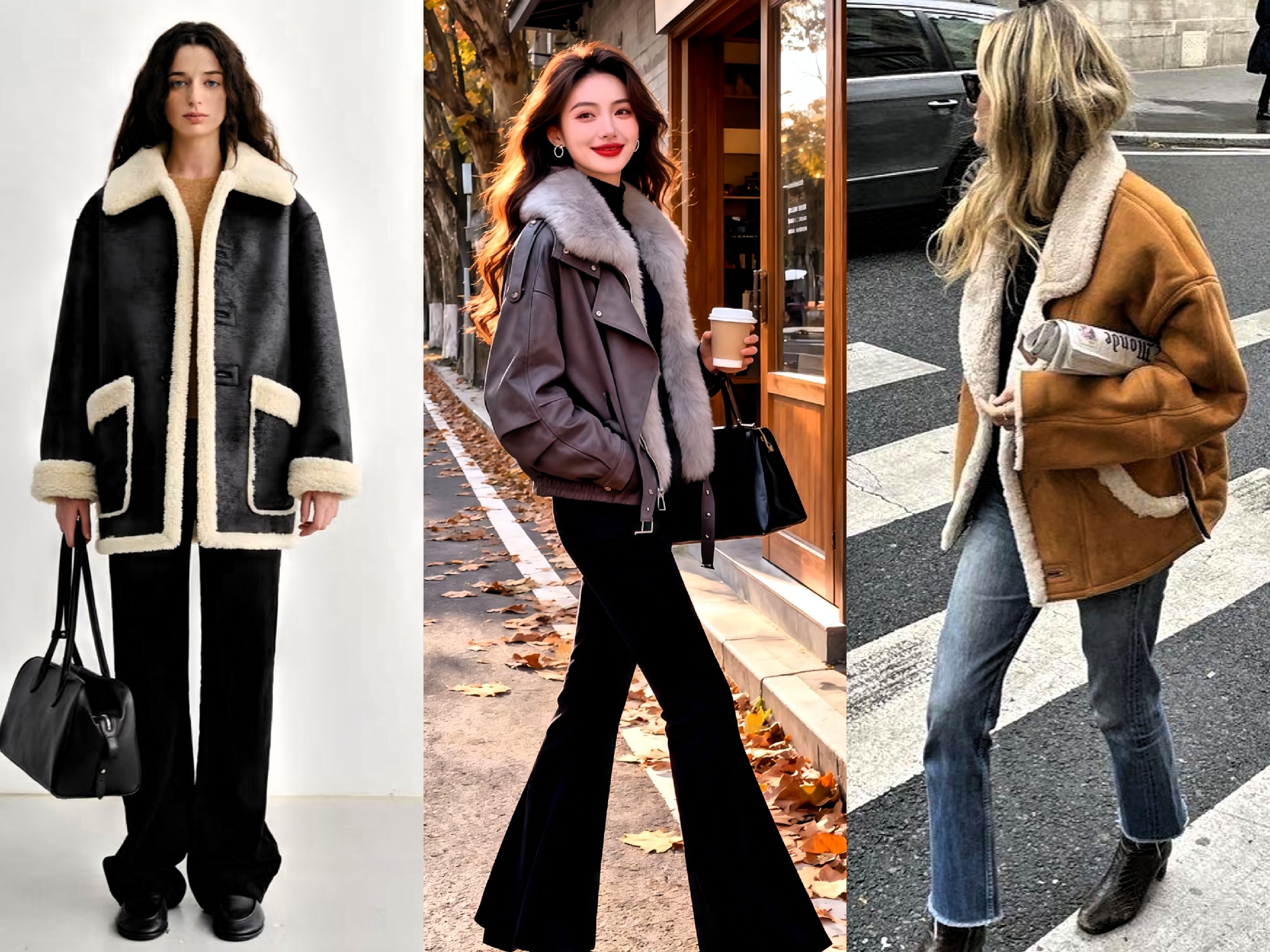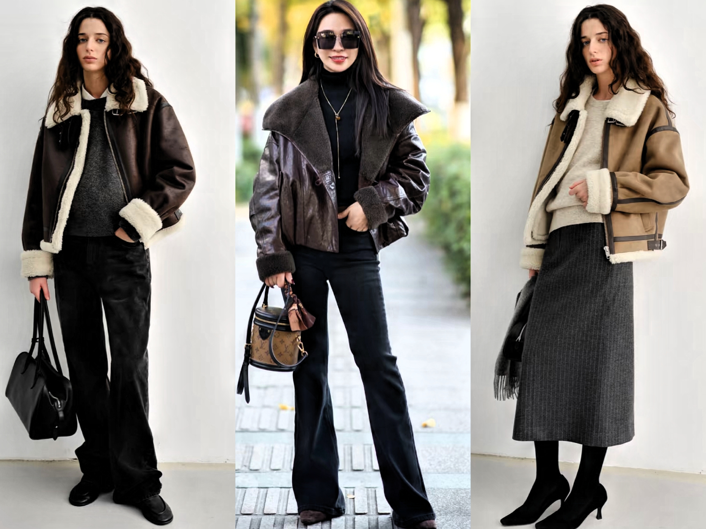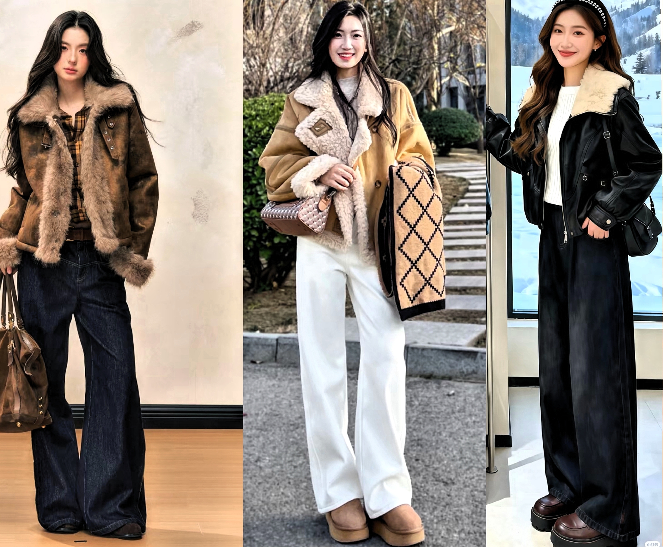 普通身材女性,优先选择短款皮毛一体衣,视觉上抬高腰线。下装搭配高腰阔腿裤或直筒半裙,利用上短下长搭配,拉长腿部线条,穿出上三下七黄金比例。