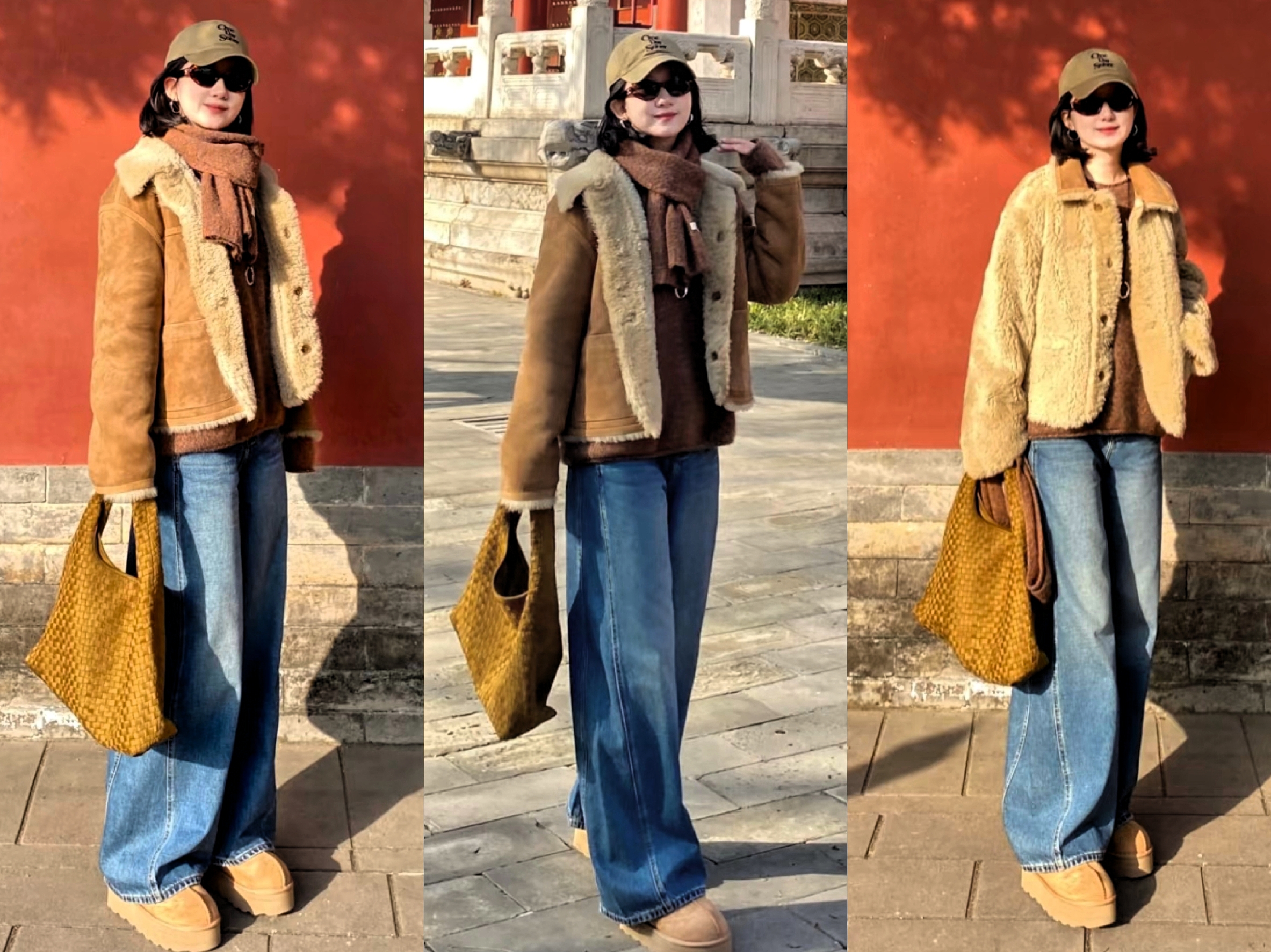 如棕色皮毛一体衣,内搭米色高领打底衫,直筒裤顺色延伸,纵向拉长身体线条。雪地靴和贝雷帽及包包,选择和外套颜色一致,造型保暖时髦且氛围感拉满。