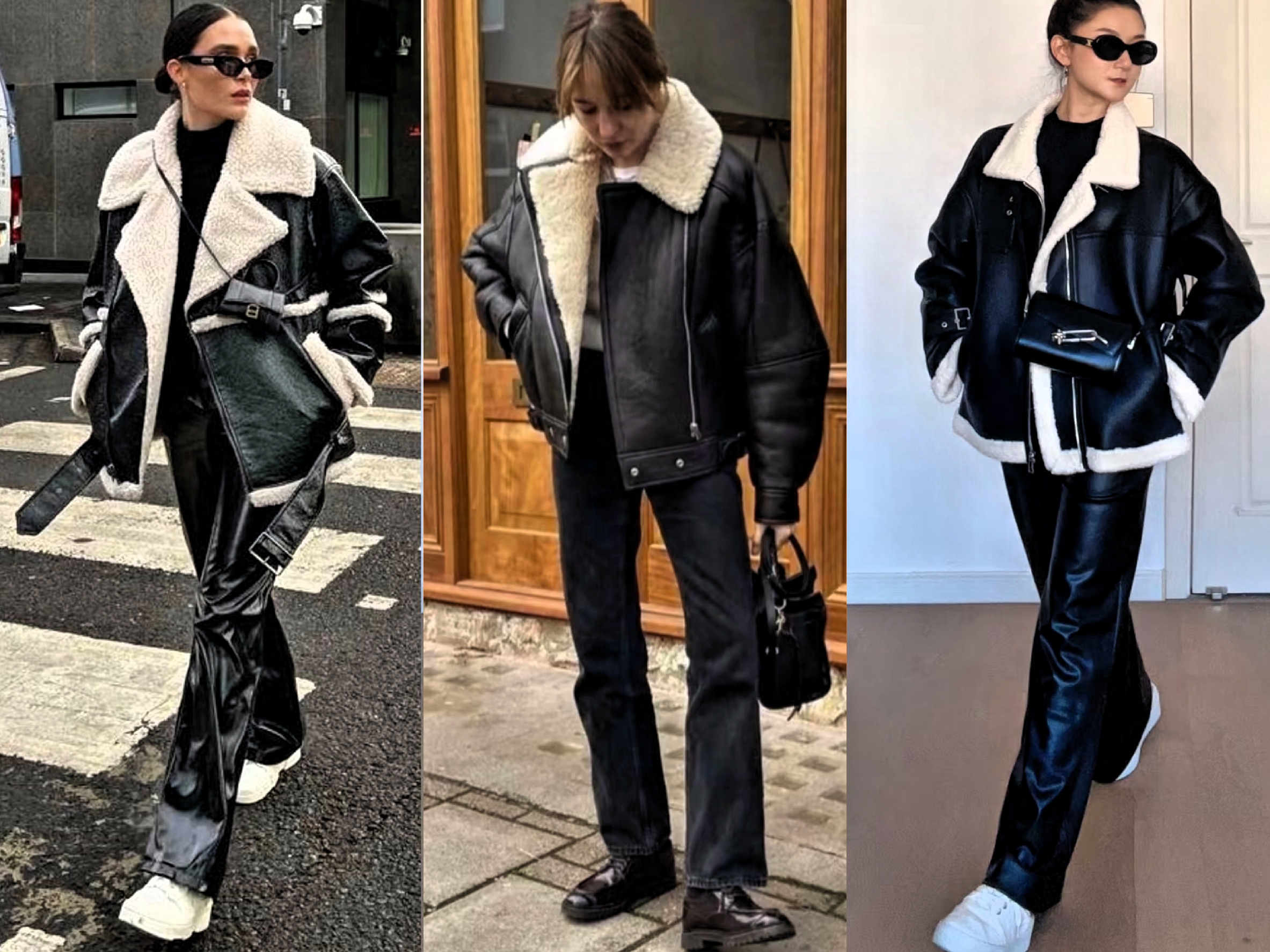 皮毛一体衣和裤子之间,整体选择同色系不同深浅搭配,或同色不同材质组合,造型和谐高级又层次丰富。如黑色皮毛一体衣,内搭黑色高领打底衫,再搭配黑色皮裤,小白鞋点缀,时髦高级有层次感。