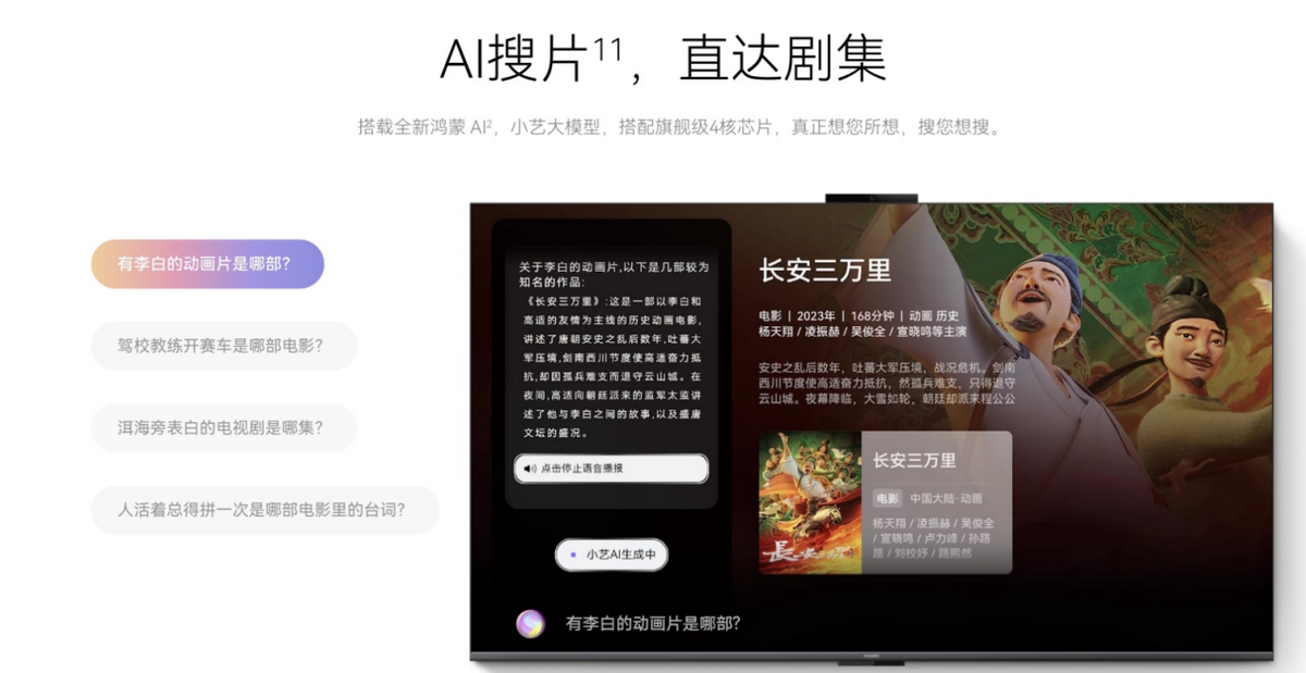如果说顶级的音画表现是一台优秀电视的“固有实力”,那么颠覆性的智慧交互则是华为Vision智慧屏 5 Pro的“超能力”。在日常观影观剧的时候,我们常会遇到“记得剧情却想不起片名”的尴尬。华为Vision智慧屏 5 Pro搭载了Mate系列同源的小艺语音助手,在AI搜片功能上实现全新升级,只需对小艺说出模糊描述,例如“沈腾演的赛车的电影”或“台词里有‘这瓜保熟吗’的剧”,小艺便能快速理解并精准定位片源,让找片变得轻松简单。同时,鸿蒙AI的百科问答和AIGC功能也非常实用。对于家长来说,小艺堪称辅导孩子学习的智能伙伴,无论是孩子天马行空的提问,还是“潮汐是怎样形成的”等具体问题,小艺都能给出清晰准确的解答。而当孩子写作文遇到困难时,AIGC功能可辅助作诗、写作,还能出数学题、玩成语接龙,为学习过程注入活力,让知识获取不再枯燥。