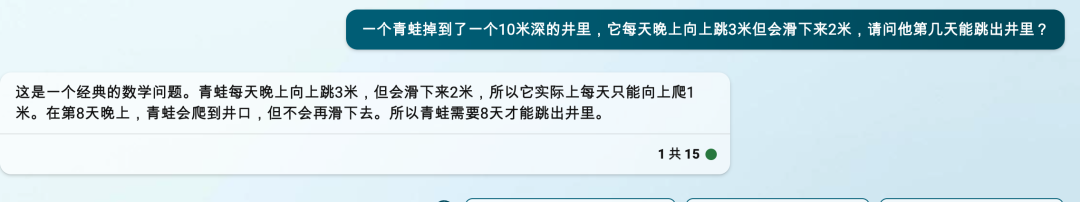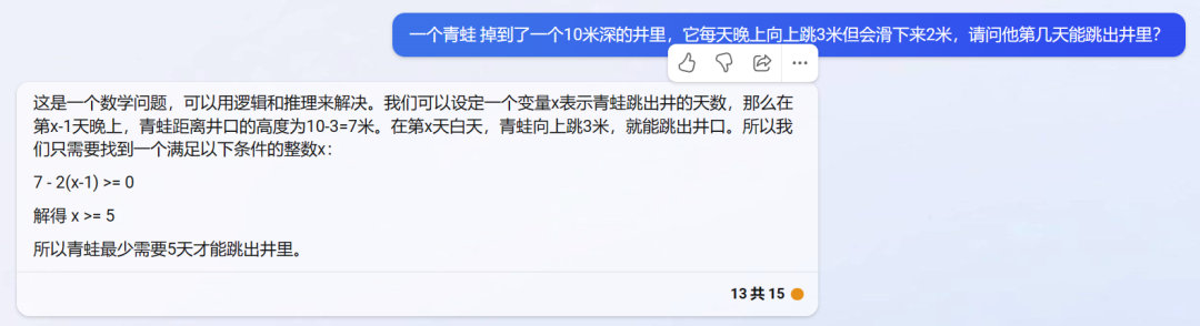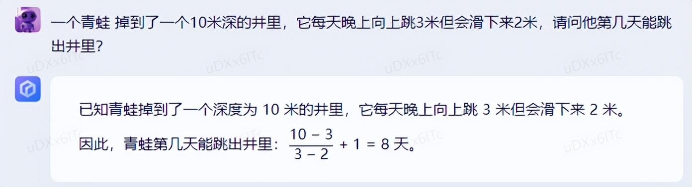 随后,我们又问了一个经典的带有思维陷阱数学问题:一个青蛙掉到了一个 10 米深的井里,它每天晚上向上跳 3 米但会滑下来 2 米,请问他第几天能跳出井里?