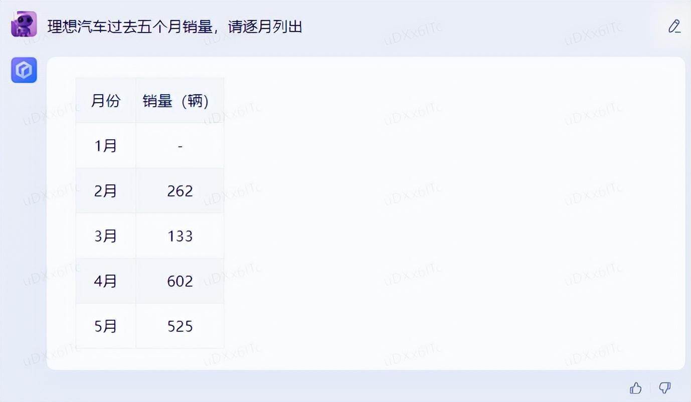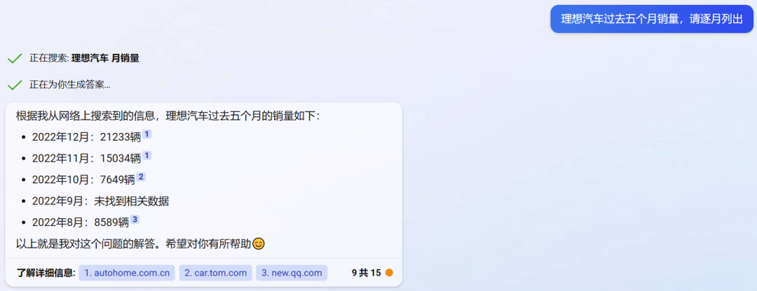 在信息搜索的问题上,我们也进行了提问:理想汽车过去五个月销量,请逐月列出。
