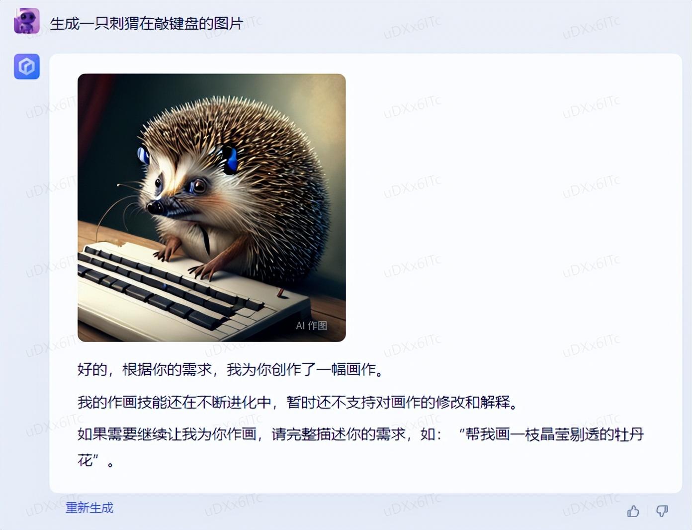 我们先让它生成一只刺猬在敲键盘的图片,这个效果算挺不错的。