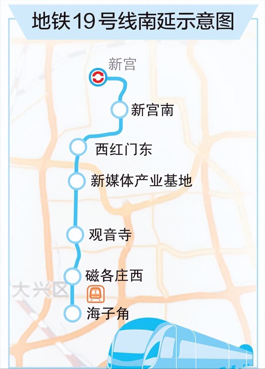 19号线南延全长大约12.7公里,从新宫一路往南延伸到海子角站,共设6座车站,线路全地下,还要在团河新建一座占地约15公顷的停车场。