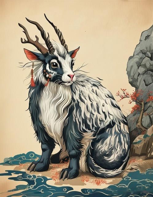 有一种兽,形状像羊,九条尾、四只眼,耳朵长在背上,名叫猼訑,佩戴它的皮毛不会畏惧。
