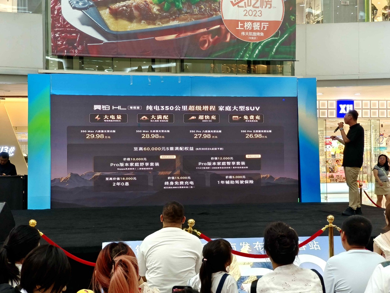 当晚的红旗万达广场,被精心布置的灯光点缀得熠熠生辉。巨大的LED屏幕矗立在舞台中央,循环播放着昊铂HL增程版的宣传片,吸引了不少市民驻足观看。