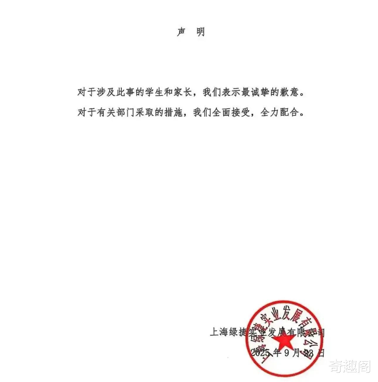 换句话说,你们质疑绿捷公司,岂不是质疑此前的招标流程吗?所以说家长发现饭菜有问题,而且特别难吃,那只能说个人口味不一样了,你怎么能怪人家头上呢?我觉得的吧,这件事情官方调查了,也通报处理了,结果也就这样了。可绿捷那边偏偏发了一个声明,引起巨大的争议。