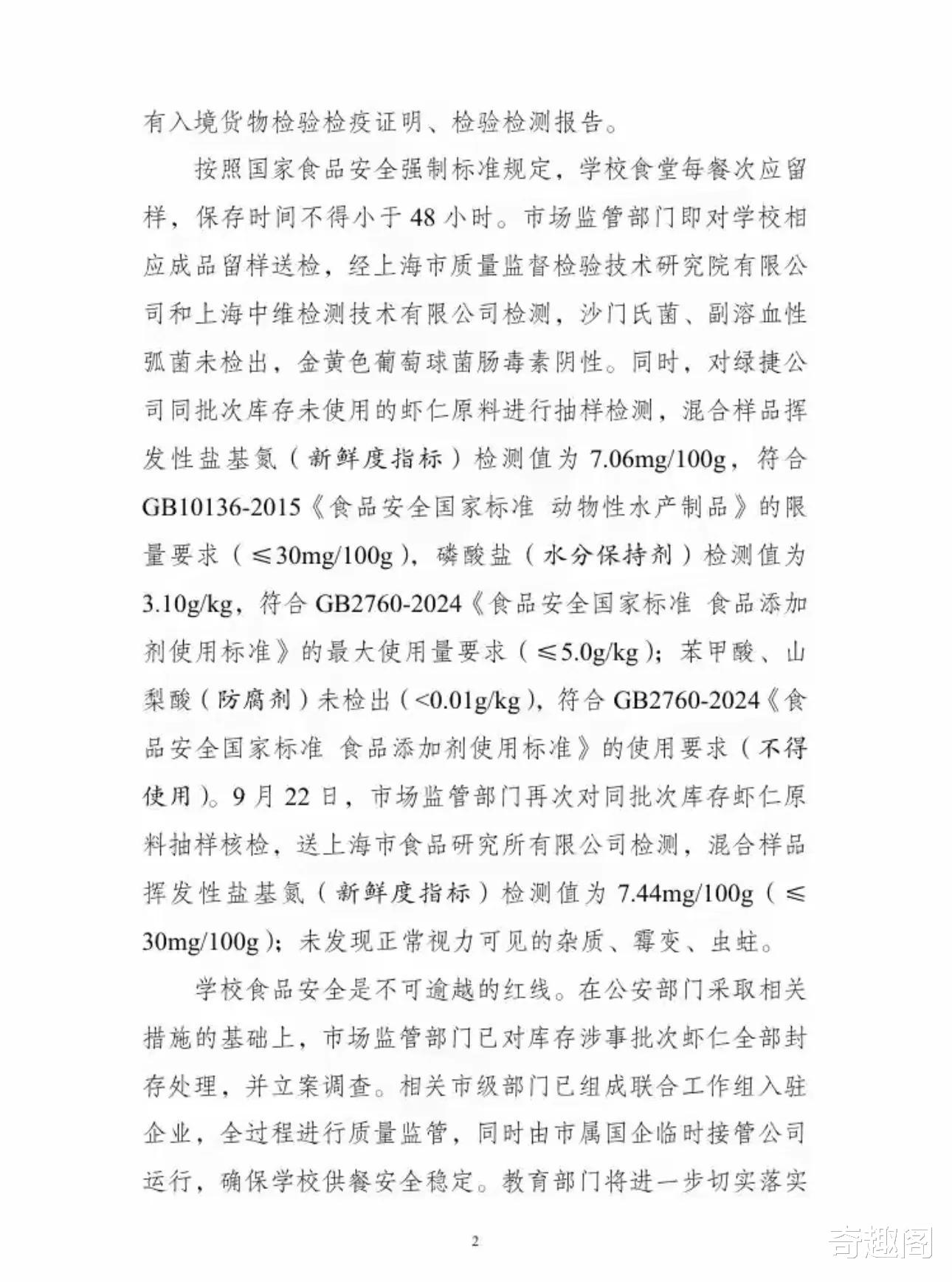 我们细看这份调查结果,除了有涉嫌隐瞒,好像也没有什么过分的问题。虾仁留样批次检测、新鲜度指标、水分保持剂指标、防腐剂等指标皆符合国家标准。二次复检也未发现杂质、霉变或虫蛀。目前市属国企已临时接管绿捷,确保校园供餐稳定。