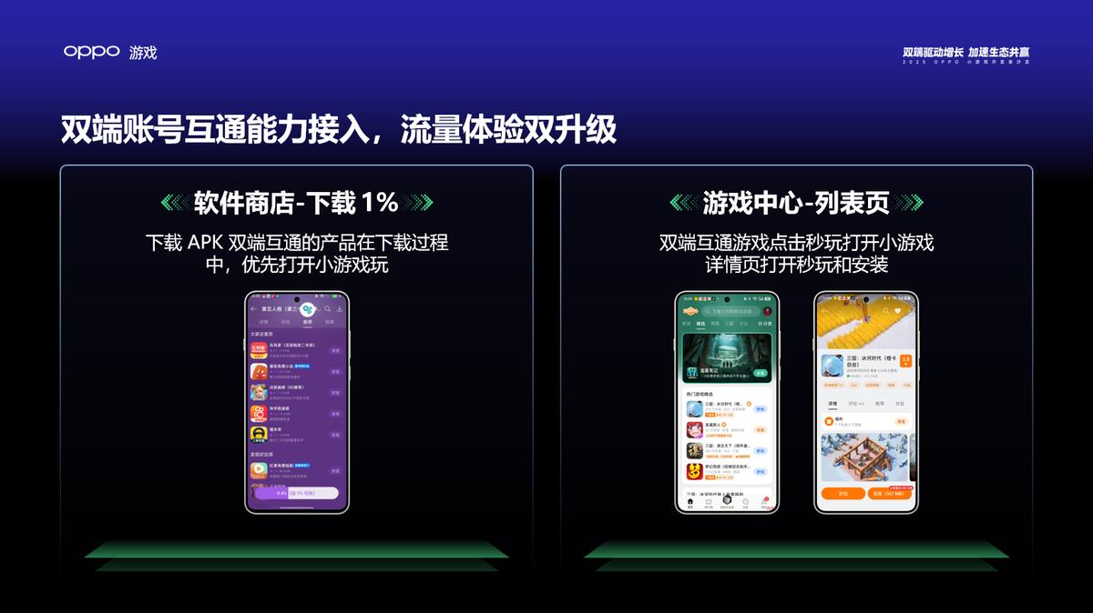 针对行业痛点,OPPO 游戏在本次沙龙上提出以“双端互通”为核心的差异化解决方案。据悉,该方案依托 OPPO 系统级生态能力,旨在打破小游戏与游戏应用之间的技术及体验壁垒。一方面,通过小游戏轻量易触达的特性,广泛连接泛娱乐用户;另一方面,当用户产生深度体验意愿时,可无缝引导至功能完整、体验沉浸的传统游戏应用,形成“前段广度获客-后端深度沉淀”的新增长路径,从而实现高价值用户的精准沉淀与长期运营。