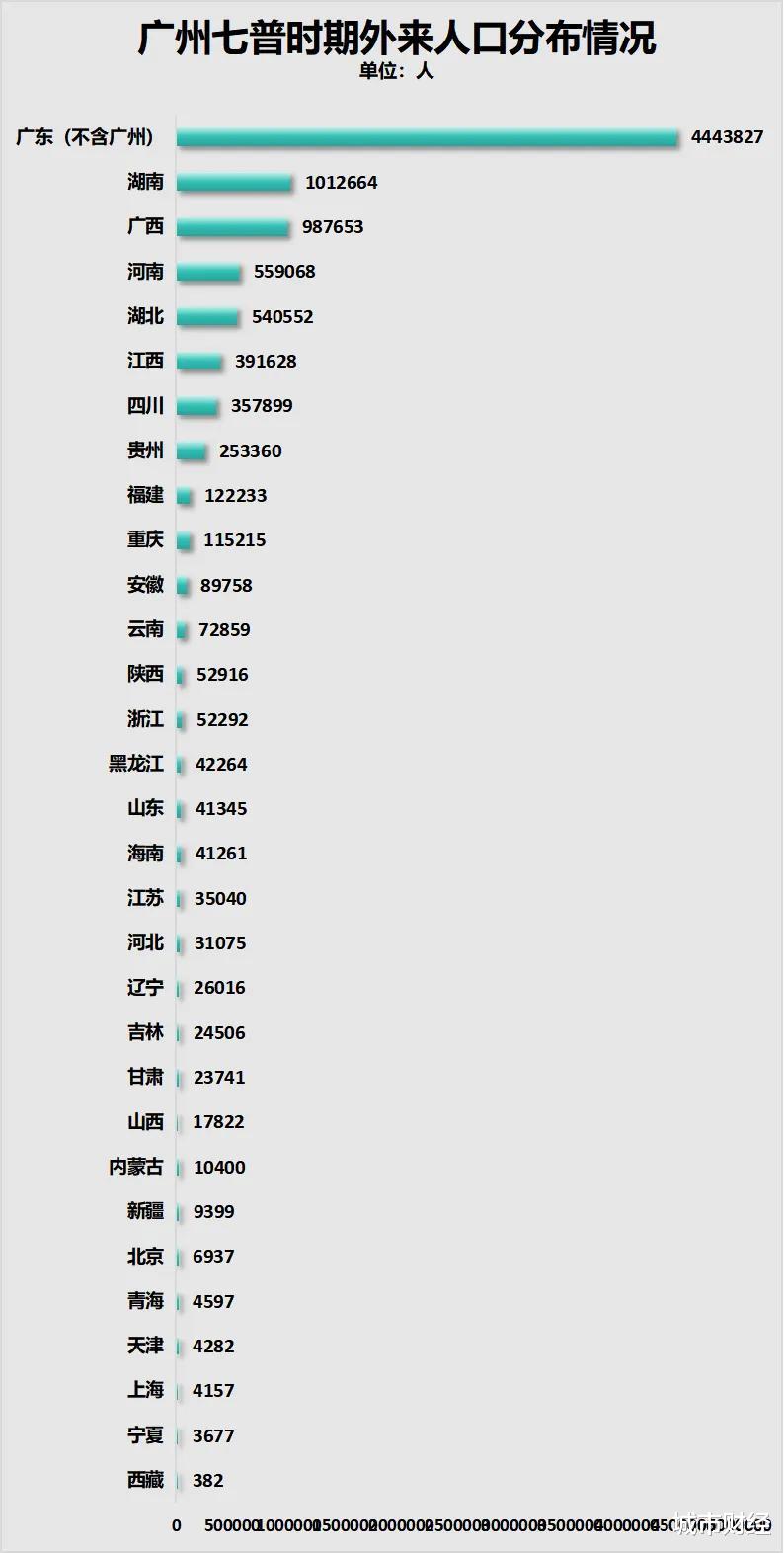 广州937.88万外来人口中,本省人口(不含广州的广东省其他城市人口)占比同样最多,高达444.38万人。
