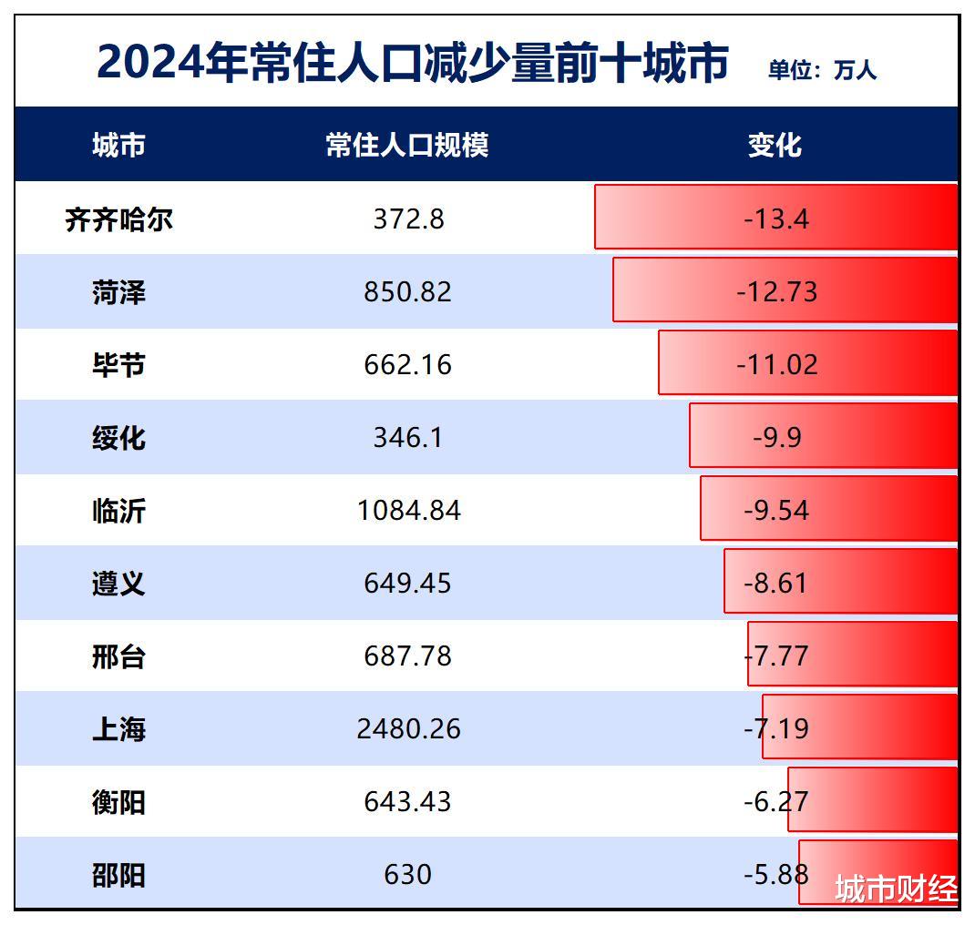 人口减少排名前十的城市分别是齐齐哈尔(黑龙江)、菏泽(山东)、毕节(贵州)、绥化(黑龙江)、临沂(山东)、遵义(贵州)、邢台(河北)、上海、衡阳(湖南)、邵阳(湖南)。