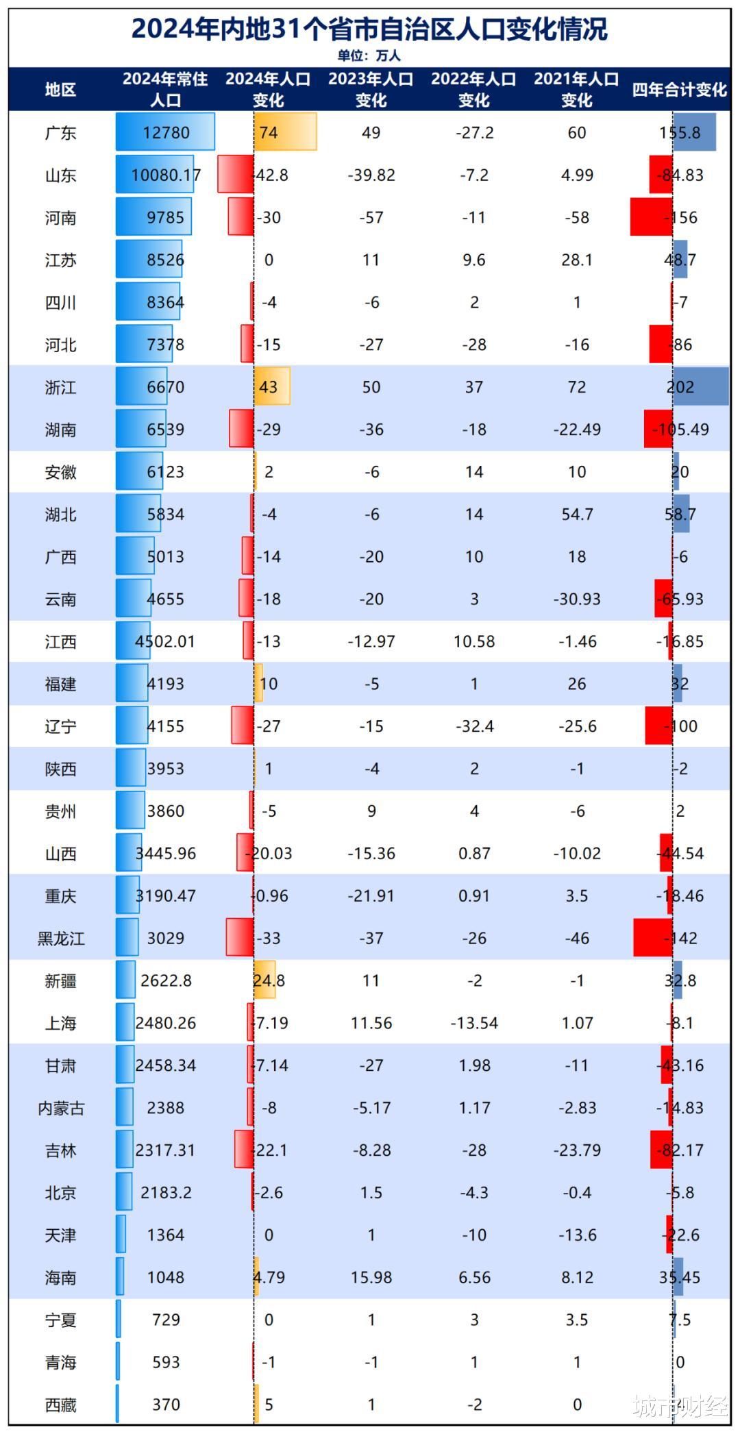 第二,四年常住人口合计减少超100万,减少量位居南方第一,全国第三。