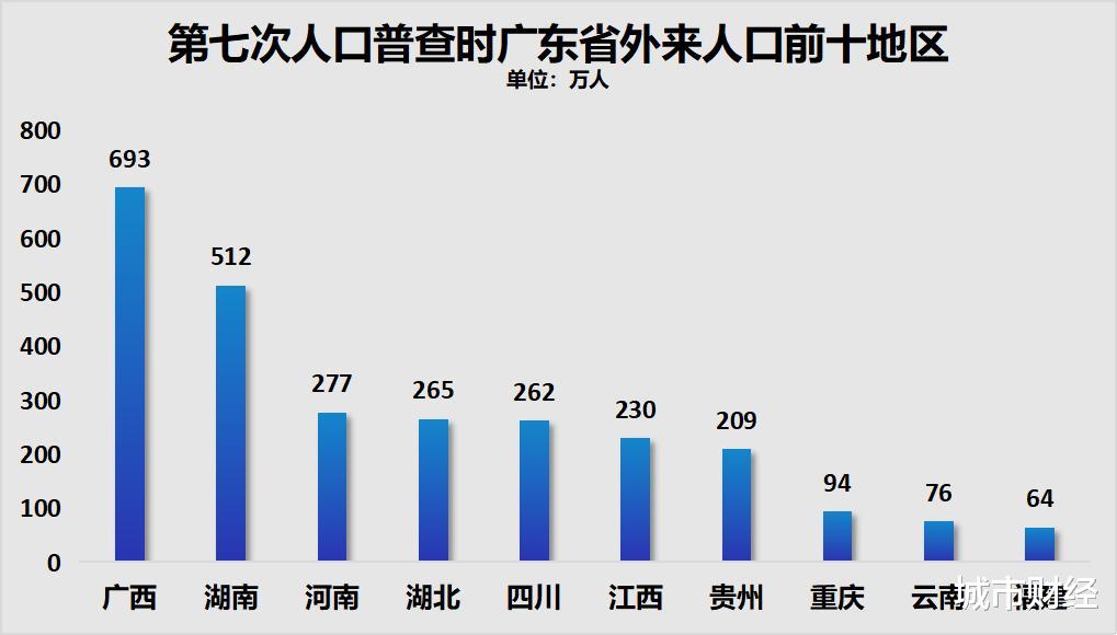 这2962万外地人中,广西人最多,有693万人。其次是湖南512万人。河南、湖北、四川、江西、贵州、重庆、云南、福建位居前十。