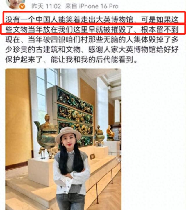 夏馨雨晒出了自己在英国大英博物馆的许多留影,而照片中的那些珍贵的佛像、青铜鼎炉、精致瓷器,正是当年西方侵略者从我国清朝时期掳走的文物。