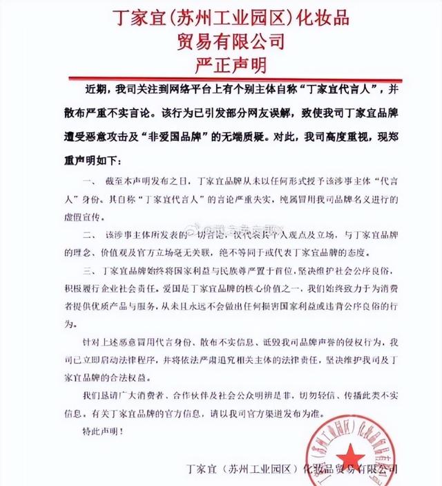 随着夏馨雨不当言论的持续发酵,吓得国货护肤品牌丁家宜的官方也是赶紧出面“辟谣”澄清。