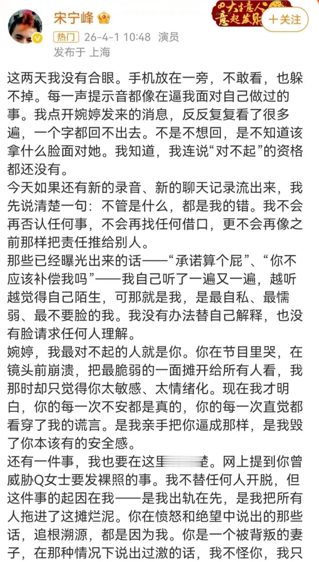 宋宁峰,如果真的如你所说“承担所有”,请把这篇长文里的“情绪”,换算成实打实的“代价”。否则,这不过是娱乐圈又一份精致的“废纸”,而公众的耐心,不该被如此廉价地消费。