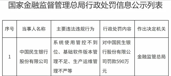 几天前的9月12日,国家金融监督管理总局行政处罚信息公示列表显示,中国民生银行股份有限公司(下简称“民生银行”)因系统使用管控不到位、基础软件版本管理不足、生产运维管理不严等,被罚款590万元。