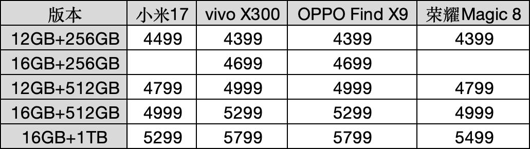 价格部分四款机型的起步价都选在了4399或者4499,虽说起步价差不多,但高阶存储版本上面还是有比较明显的差异,具体来说小米17和荣耀Magic 8的高阶存储版本定价更加实惠,vivo X300和OPPO Find X9的高阶版本更高,特别是顶配版本的吃相有点难看。