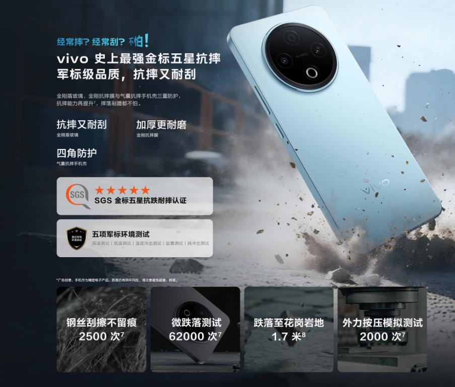 在手机市场中,耐用性一直是消费者关注的重点,刚刚亮相的vivo Y500就以全面升级的超强耐用性表现尤为引人注目。下面,我们将从几个细分项目开始对这款手机的耐用性进行简单解析,看看它在日常生活中究竟能有多耐用。