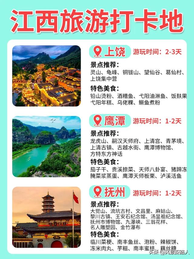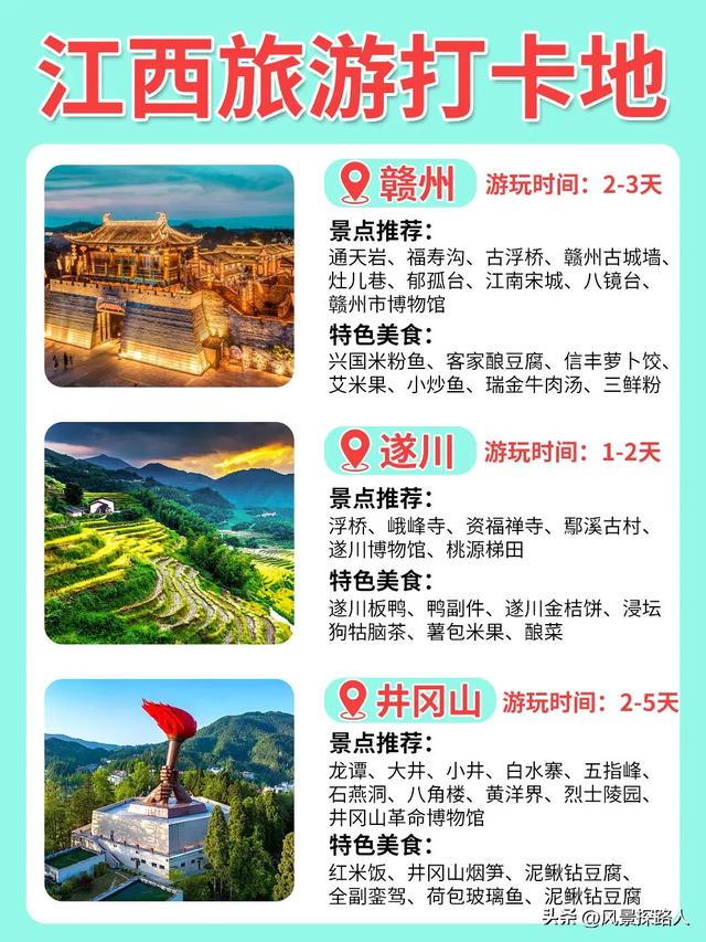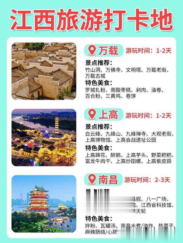 江西自驾游线路行程攻略,规划涵盖九江、庐山、宜春、抚州、南昌、赣州、井冈山、婺源、三清山、吉安、景德镇等热门游览地。景点分布有白云峰、万佛寺、明月山、五指峰、通天岩、如琴湖、上清古镇、等打卡景点,本篇攻略纯玩版本内容附带美食介绍,旅行达人可收藏备用参考。