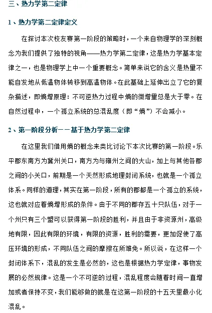 在第一阶段州内资源争夺中,他用热力学第二定律的熵增原理,剖析了同盟内耗的本质——就像孤立系统的熵总会自发增加,无序的资源竞争只会让团队战斗力不断损耗。