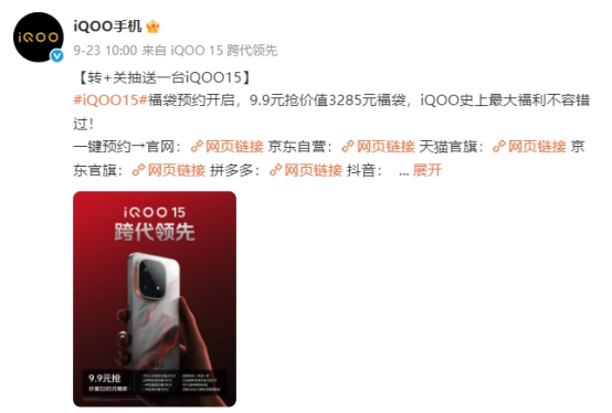 性能实力强大、游戏体验大升级的iQOO 15新品,在本月20日携iQOO WATCH GT 2、iQOO TWS 5等新品高调登场。此次iQOO为用户带来的不止是期待已久的新机,更以超多的升级刷新了游戏视效天花板以及性能天花板,还开启了9.9元新品福袋预约。