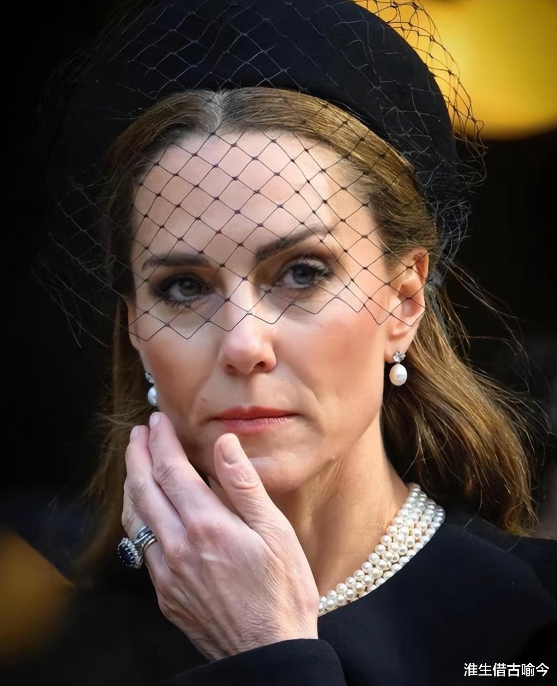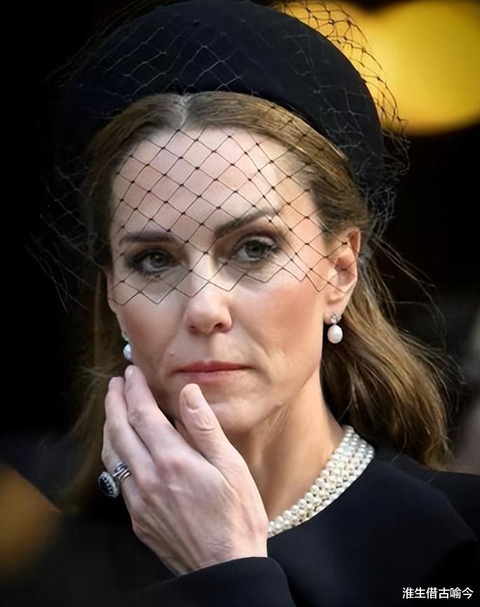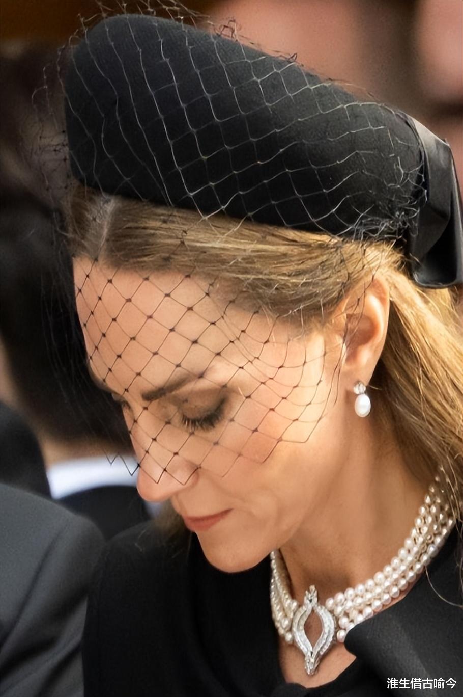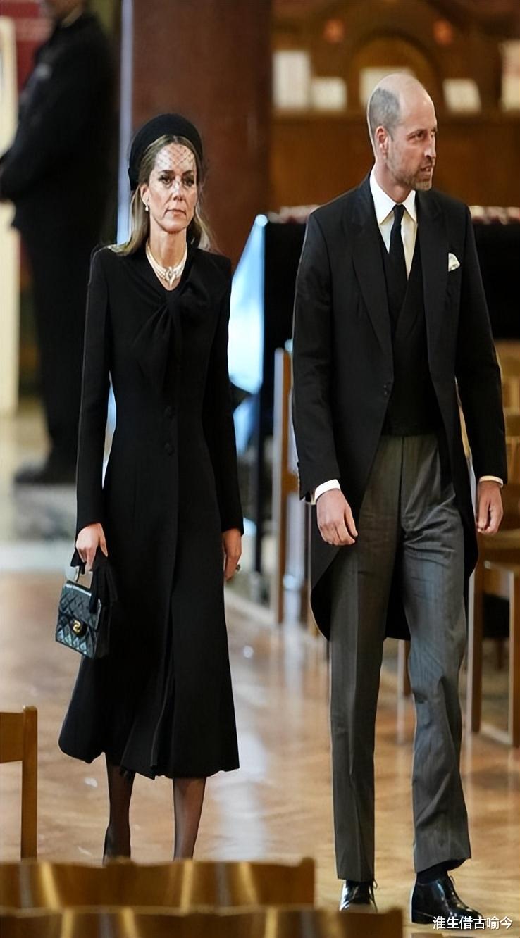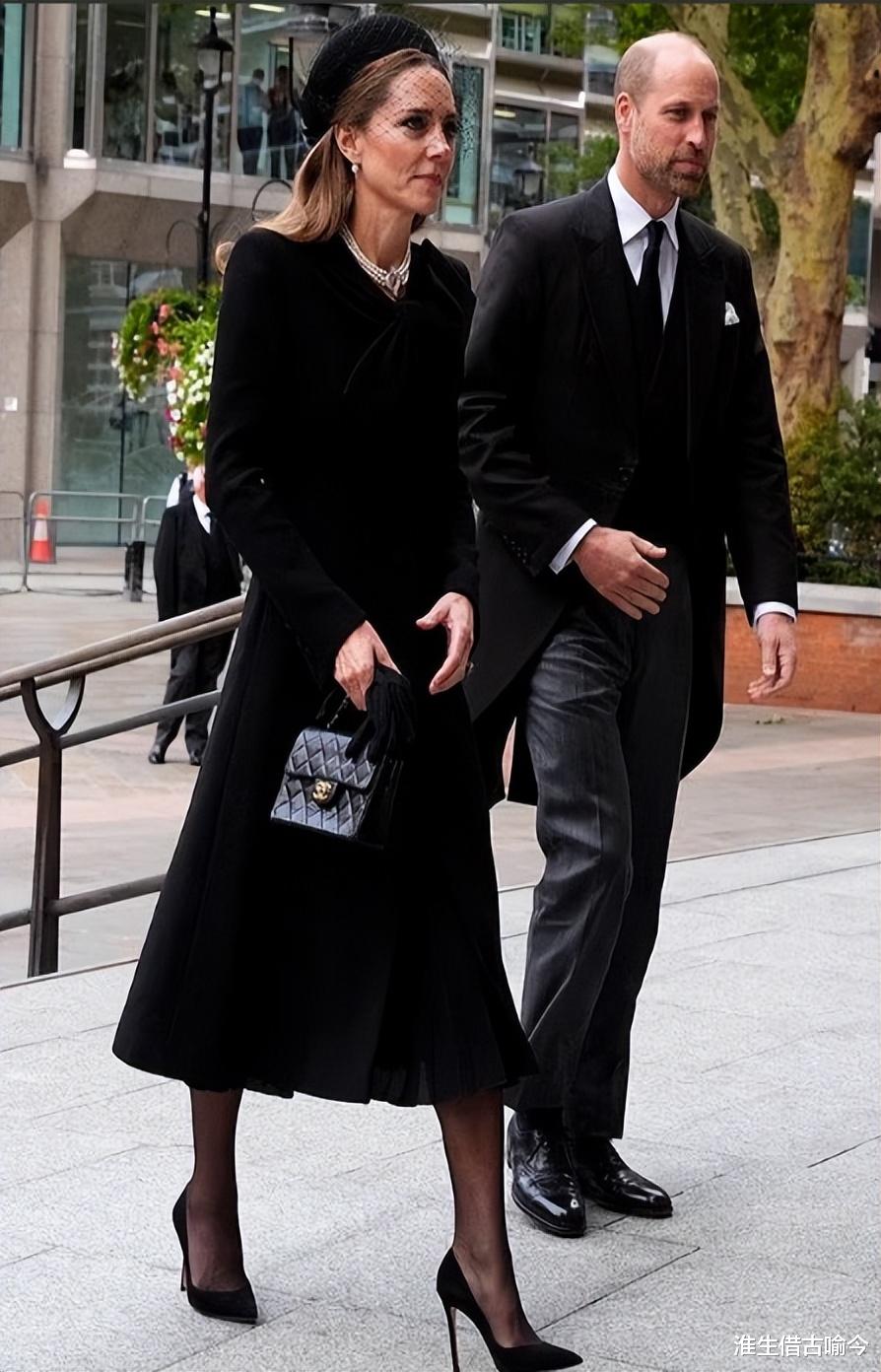 凯特当天没有选择新装,而是再次穿上了黑色羊毛蝴蝶结大衣,搭配黑色药盒礼帽与细密渔网面纱。
