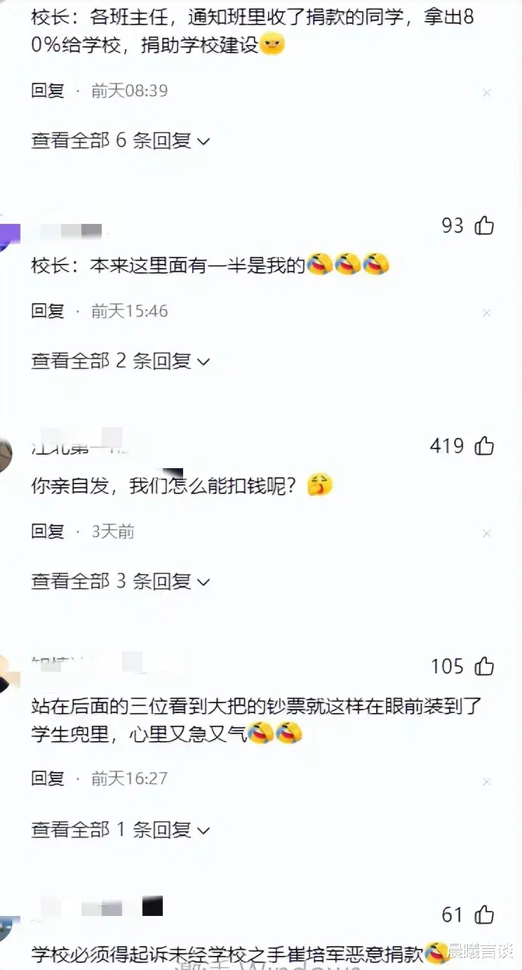 对此,网友们这评论区可是炸开了锅,各种段子手上线啊!有人打趣说:“那三位校领导啊,心里头估摸着正嘀咕呢,这上台发钱的好事儿,咋就让崔老爷子给捷足先登了?心里头那个羡慕嫉妒恨,估摸着还琢磨着能不能分杯羹呢!”