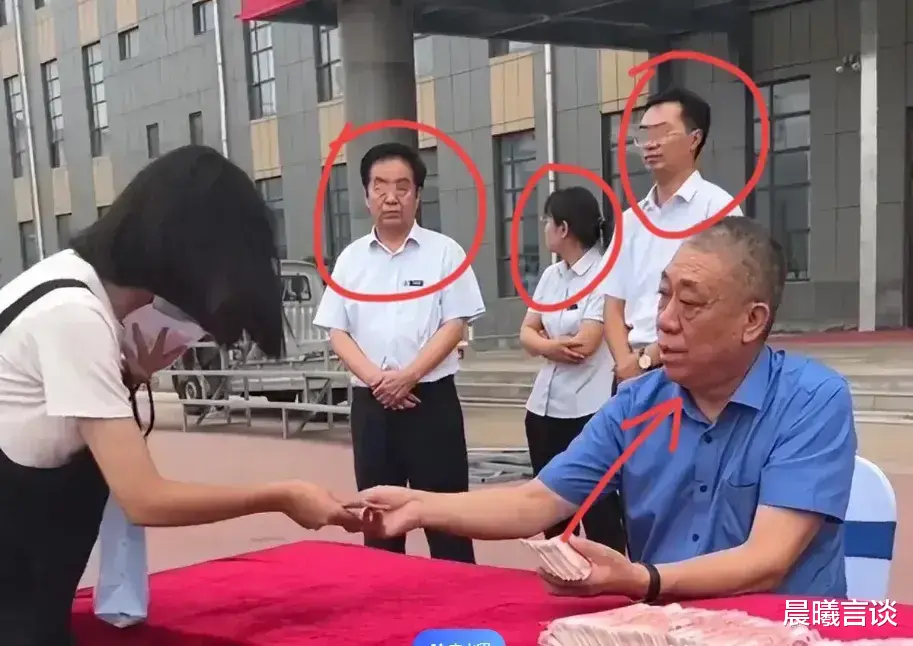 你瞧,大夏天他穿着短袖,往桌子边一坐,红布上钞票码得整整齐齐,孩子们排排站,一个个上前领钱,那画面温馨得跟啥似的。