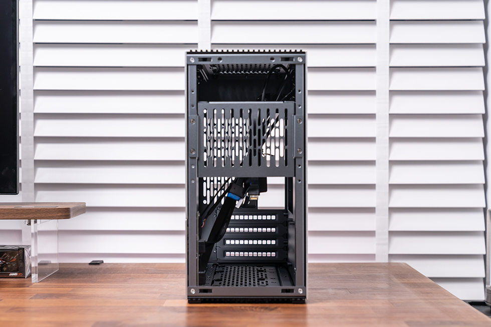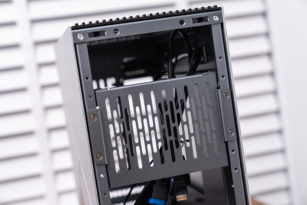 散热方面,机箱顶部支持240冷排安装,冷排框架采取可拆卸设计,通过滑轨式锁定方式免工具安装,对于这种内部空间紧凑的小机箱来说,这样的设计无疑极大的提高了安装的便捷性。背部和底部分别预留了2个和3个80mm风扇的安装位,