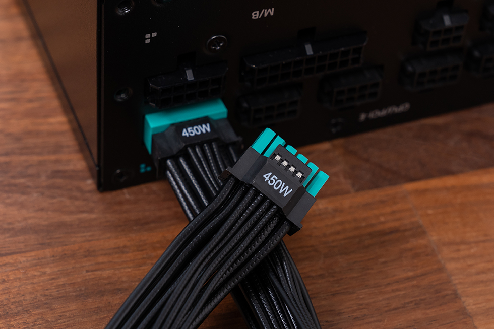 AC输入接口带有独立开关,采用全模组设计,包含了1个主板电源连接口 24 -PIN接口、4个CPU / PCI-E接口、2个S-ATA / P-ATA 接口、1个12VHPWR16-pin接口。满足基本需求;其中原生12VHPWR16-pin接口,可直接为PCle5.0显卡、扩展卡提供至高450W的供电能力,用来应对RTX50系显卡都可以满足需求。