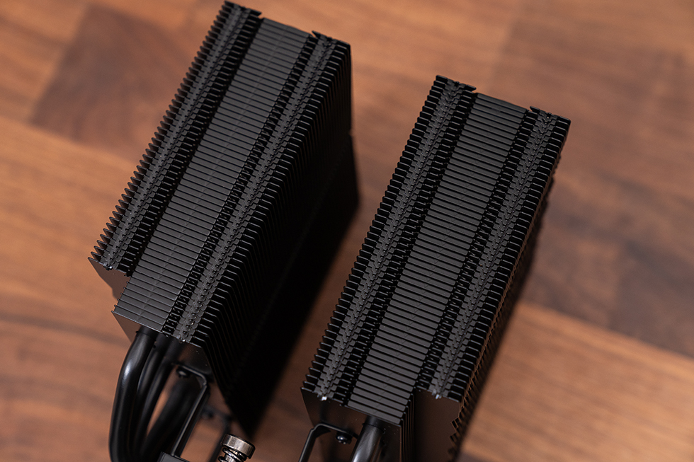 散热整体尺寸为118.5*104*94 mm,塔体鳍片采用折Fin与扣Fin复合工艺实现与热管的紧密贴合,延续家族式三角几何交错矩阵设计,基于气动声学原理有效降低运行过程中的高频噪声,为用户提供更为安静的使用体验。
