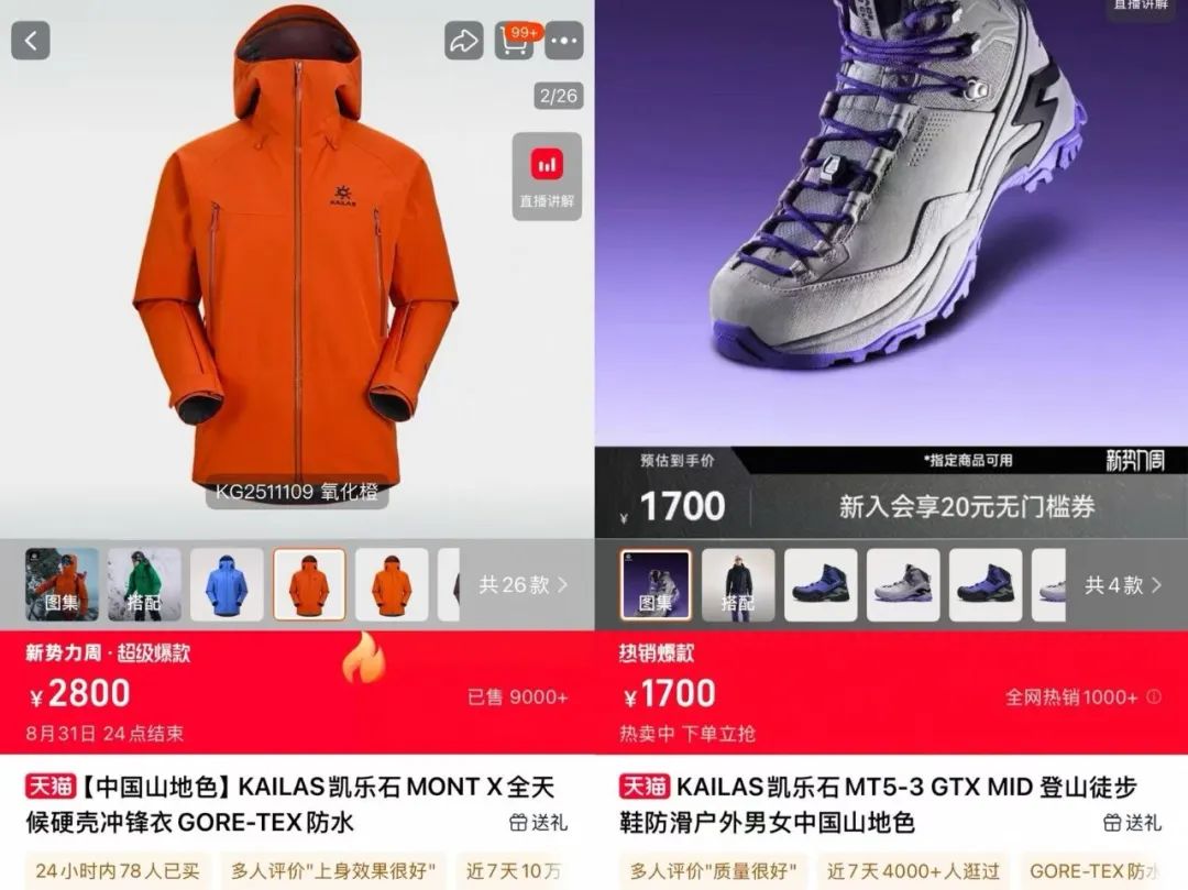 凯乐石的硬壳冲锋衣已经涨到2800元,千元级越野鞋也成为主打单品,甚至推出万元级攀登装备,几乎在明面上对标始祖鸟。有趣的是,涨价反而成效明显,凯乐石天猫官方旗舰店显示,其新品MT5登山徒步鞋,售价达到1700元,已有超4000人加购。