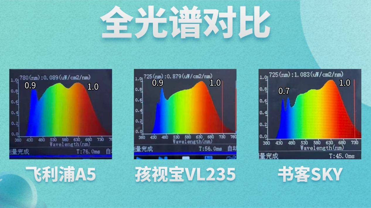 孩视宝护眼灯怎么样?我们看到这三款护眼台灯里面蓝光含量最少的是书客SKY这款,实测出来是0.7的含量,书客对蓝光方面的处理采用RRT2.0红光硬核护眼黑科技以及硬件级低蓝光技术,两者从软硬方面一并出发,在精准抑制400~450nm有害蓝光的同时,还能够为眼部输送“营养”,每天只需要三分钟,可以促进眼轴发育的健康,减缓青少年90%的近视发展速度。而孩视宝VL235和飞利浦A5的蓝光含量都是0.9,长时间使用的话更容易引起眼睛的疲劳感。