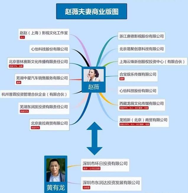 2014年,赵薇入股她哥哥的公司唐德影视IPO上市,两人持有股票估值超过4亿,2014年12月,赵薇和丈夫黄有龙花31亿港元购买阿里巴巴影业股份,成为公司的第二大股东。