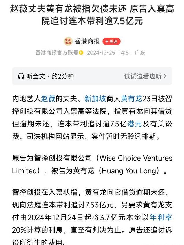 根据香港商报官方媒体报道,12月23日,赵薇前夫黄有龙被智择创投公司入禀高等法院,指黄有龙向其借贷7.53亿港元逾期未还,现连本带利追讨逾12.1亿港元。