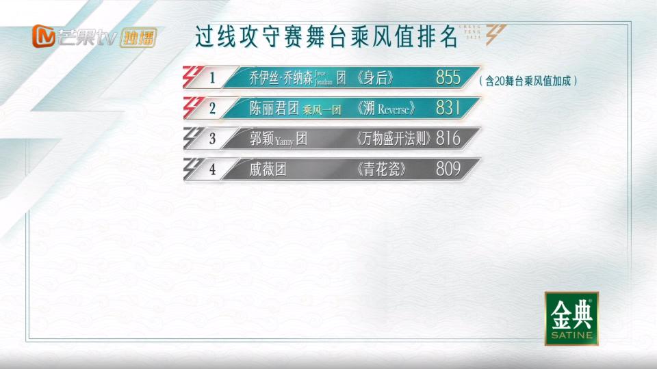 但第4位出场的韩雪与Joyce,硬是在yamy团队、戚薇团队挑战失败的情况下,顶住了重重压力,拿下了835的舞台票数,再加上二公赛前秀、韩雪凭借个人实力赢下的20分乘风值,进一步稳固住了第一名的宝座,助力她们团队成为下一场新的乘风一团,加大了砝码。