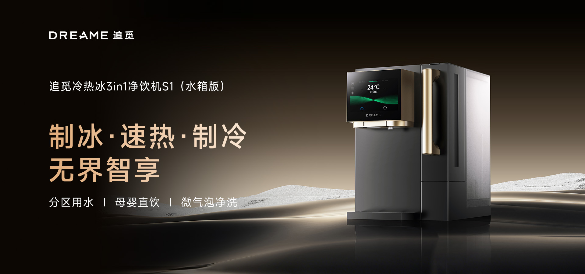 追觅冷热冰3in1净饮机S1(水箱版)突破性整合纯水制冰、CryoFlash™瞬冷冰水与HeatWave™真沸水三大功能,配合UV+超能水离子科技,实现“一机三用”的集成化饮水体验。其占地仅0.09m²,却完整集成制冷、制热、制冰三大功能。