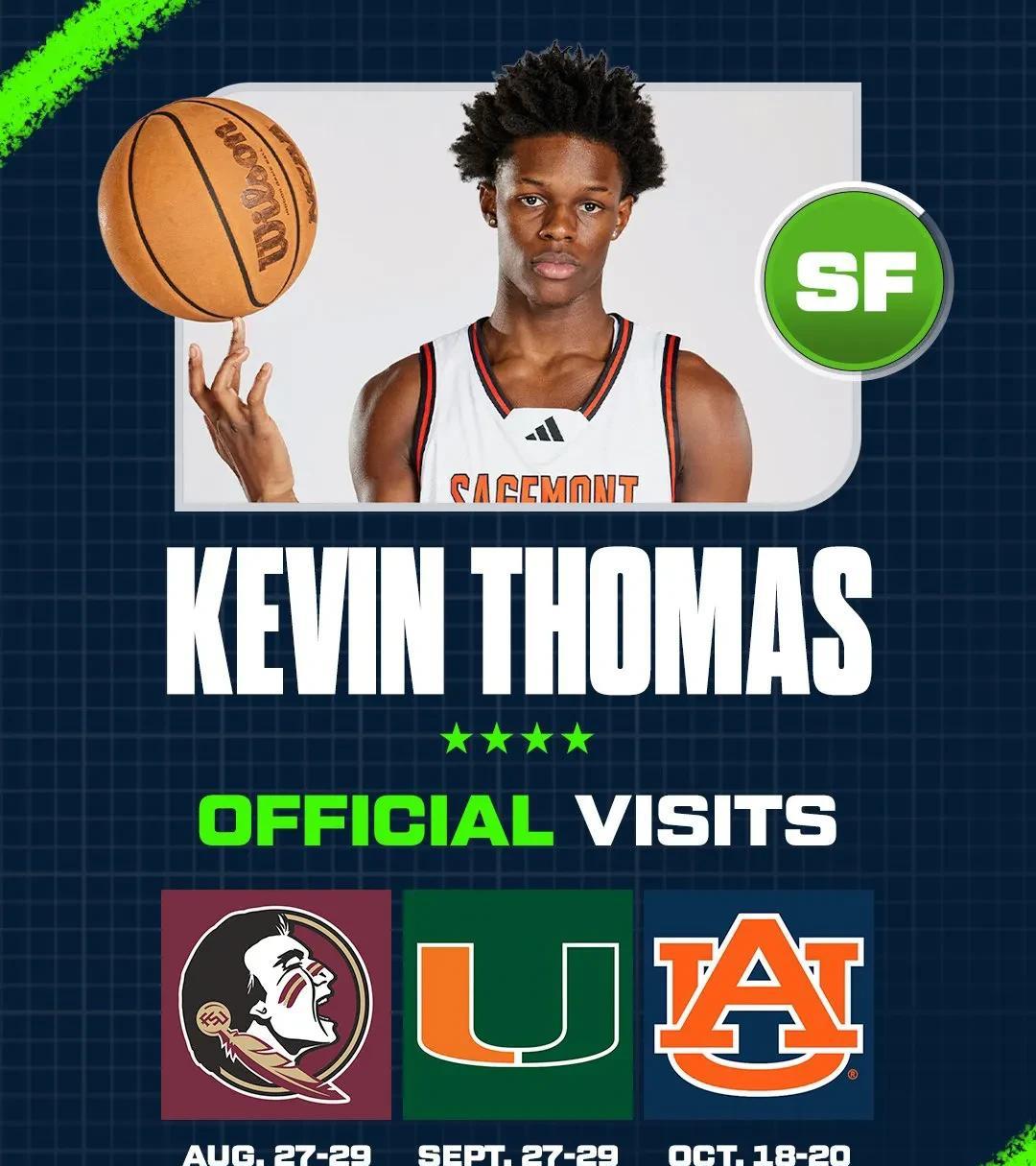 #2026届招生# TOP50四星小前锋Kevin Thomas宣布高四赛季转学至佛罗里达州Montverde Academy,今夏效力于北卡州Jet Academy俱乐部,他计划访问佛罗里达州立,迈阿密与奥本大学。