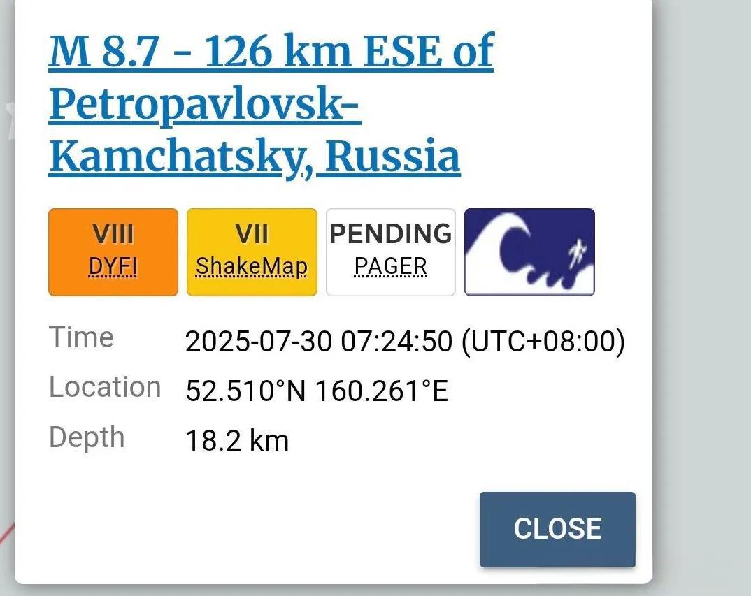 日本发布海啸警报,俄罗斯大地震震级上调至8.7级 今早俄罗斯堪察加半岛东岸海域发