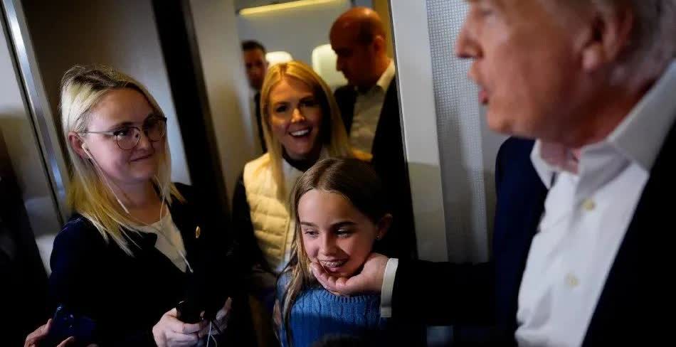 老特搂着孙女克洛伊在空军一号上采访,称“这个小女孩有很多肌肉”。 他们正在从苏格兰飞往美国的途中。 白宫新闻秘书莱维特在旁边笑逐颜开。