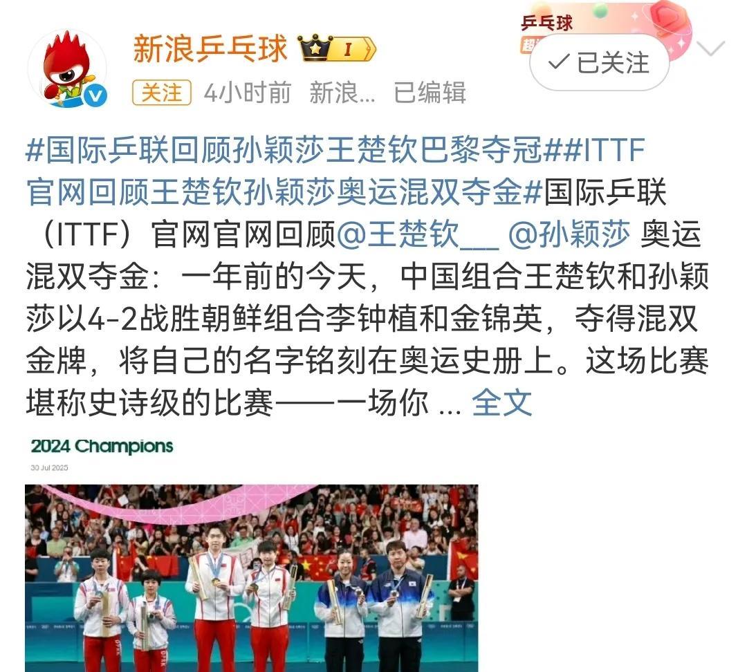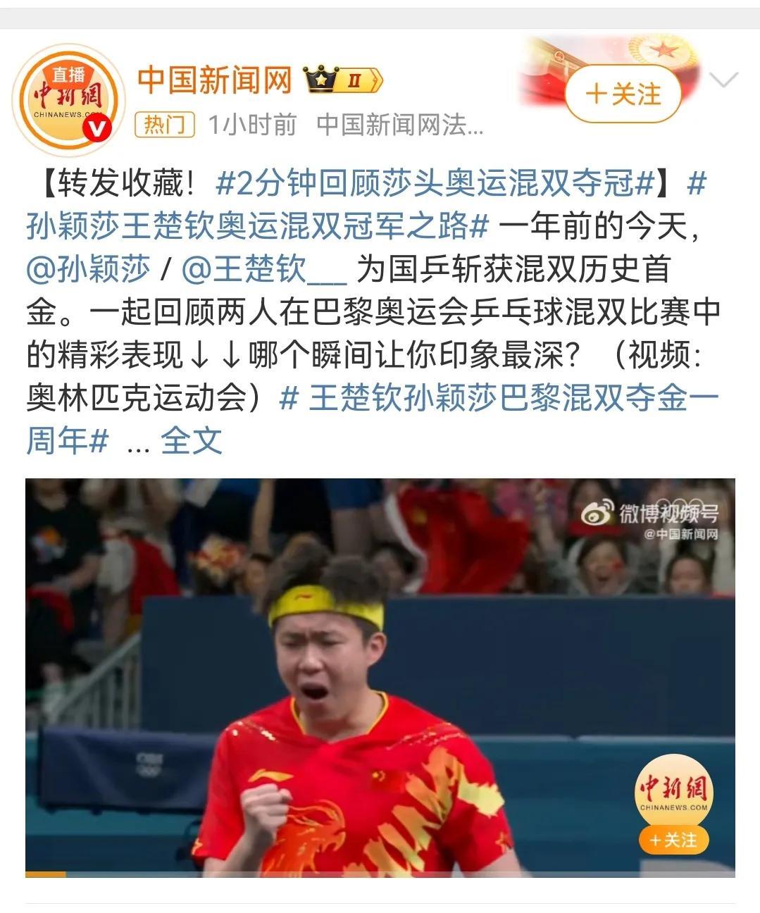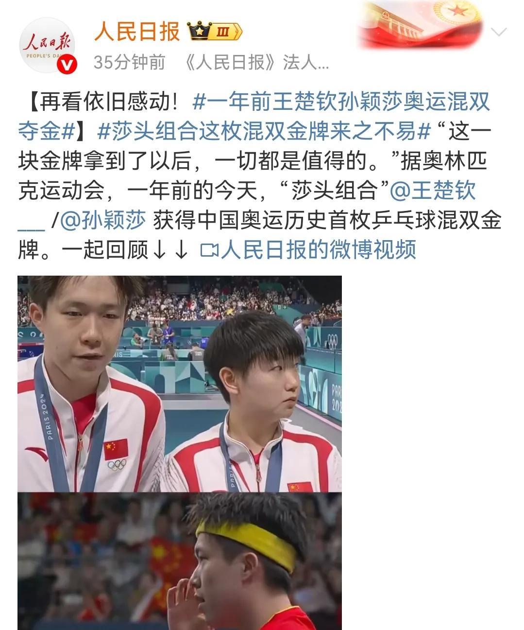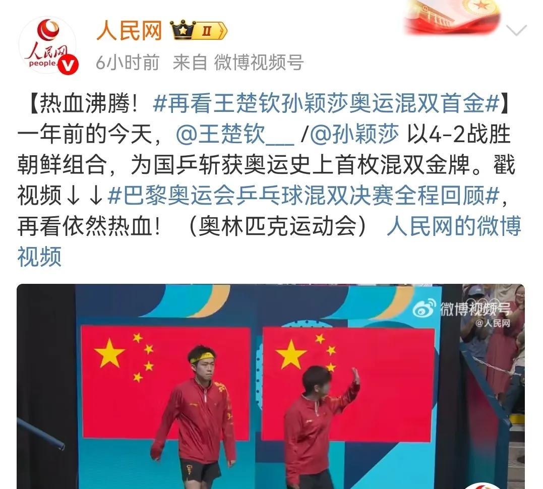 孙颖莎、王楚钦巴黎奥运混双夺冠一周年,和央妈一起重温巴黎奥运会混双决赛。 回看巴黎奥运混双决赛,会发现其实双方选手都很紧张,只是孙颖莎的控场能力更强,第一局中国队在自己的发球轮拿了两分,朝鲜队在自己的发球轮一分未得。 对于中国混双组合来说,对朝鲜组合的打球风格一无所知,所以朝鲜组合才有了神秘之师的说法。 第一局朝鲜组合女选手金琴英率先发球,孙颖莎接发球,朝鲜男选手李正直挑打失误,中国队率先拿下第一分,第二分来自王楚钦的反手推挑得分,孙颖莎的第一个发球轮,王楚钦回球撞网,朝鲜队拿下第一分,莎莎的第二个发球王楚钦回球出台双方打成2:2,其实这一个球王楚钦也是一个回头望月的姿势,就是落点有误差,要不然这一球早就名声大振了,朝鲜队发球轮,朝鲜队男选手李正直发球,孙颖莎一个抢攻小三角拿下一分,第四分来自金琴英接王楚钦回球撞网,王楚钦的发球轮金琴英一个回球出台,另外一个回球撞网,比分来到6:2,金琴英的发球轮,李正直发抢拿下一分,王楚钦接发球拿下一分,比4分来到7:3,孙颖莎的发球轮,王楚钦回球出台丢了一分,莎莎回球弹网带出台再丢一分,比分来到7:5,李正直发球,第一分王楚钦接发球抢攻得分,第二分金琴英失误回球出台,再丢一分,王楚钦的发球轮,金琴英和孙颖莎一人一人一个回球出台,金琴英的发球轮,她自己回球也能撞网,中国混双组合率先拿下第一局11:5. 第一局大家彼此试探阶段,第二局的发球轮大家得分情况大有好转,第二局中国混双组合在自己的五个发球轮一共拿了六分,朝鲜队四个发球轮拿了7分,7:7后朝鲜队李正直发球,王楚钦吃发球,孙颖莎连续回球出台,王楚钦回球撞网,朝鲜队连得四分11:7扳回一局。 第三局中国混双组合在自己的4.5个发球轮拿下五分,朝鲜队在自己的五个发球拿了4分,大比分2:1中国混双组合加油! 第四局中国混双打了一个3:1的开局到7:2,这么领先的一局8:5孙颖莎还拿到一个滚网运气球11:5中国混双组合再拿一局,大比分来到3:1。 第五局从开始到局末都是朝鲜队领先,11:7朝鲜队再下一局大比分来到2:3。 第六局5:5之前,双方轮流得分,5:5后比分一度被追到8:8,9:8是一个非常精彩的球,王楚钦从台下把球捞起来,对方回球后孙颖莎看到对方的右半区无人看守,孙颖莎随意又补了一个直线,王楚钦给孙颖莎竖起了大拇指,恭喜中国混双4:2战胜朝鲜组合。 人民网、中国新闻网、人民日报、新华网、新华社等多家主流媒体一起一起回顾巴黎奥运混双首金诞生,时间过去一年,今天回看这场比赛,依然非常激动,也非常感动!感动两位年轻人场上互相鼓励,第四局王楚钦接发球反手拧拉得分,孙颖莎脱口而出“漂亮”,第六局9:8王楚钦从台下捞起来一个球,对方回球孙颖莎看准机会一个直线,王楚钦毫不犹豫的竖起大拇指,这就是莎头组合八年来的默契和互相鼓励,感谢热血的莎头组合守护了国球的荣耀,未来期待更好! #晒图笔记大赛#