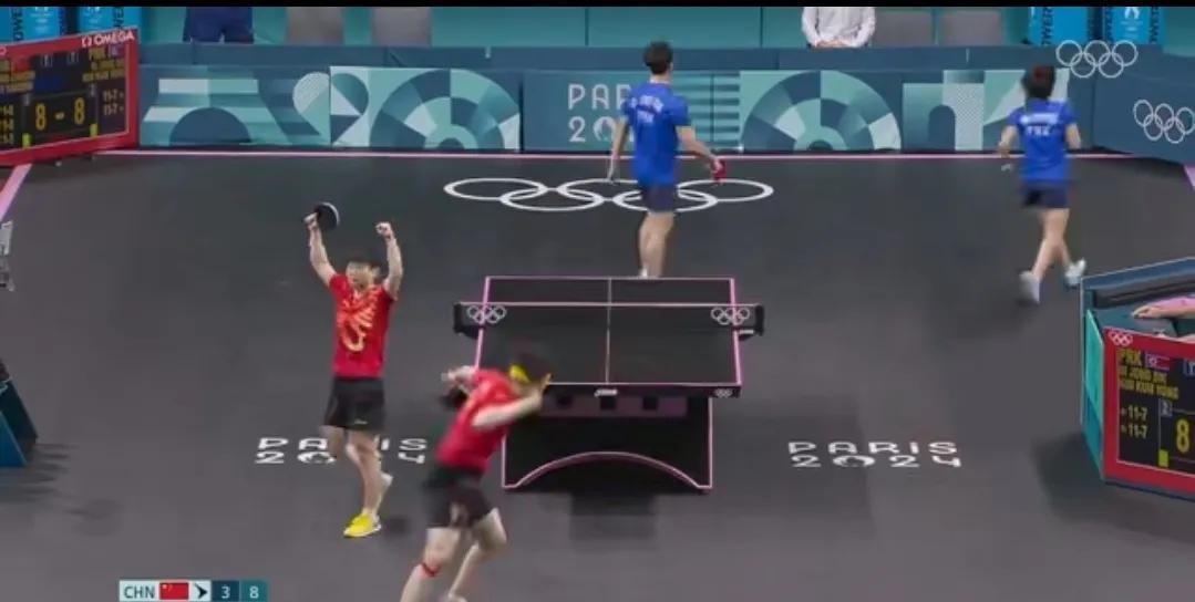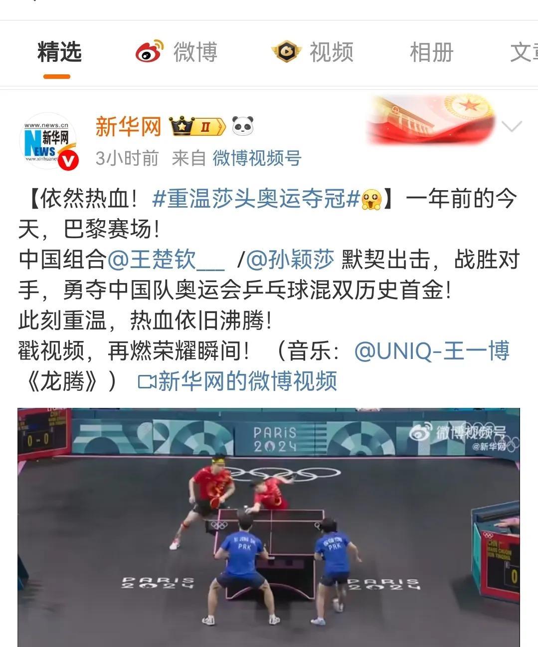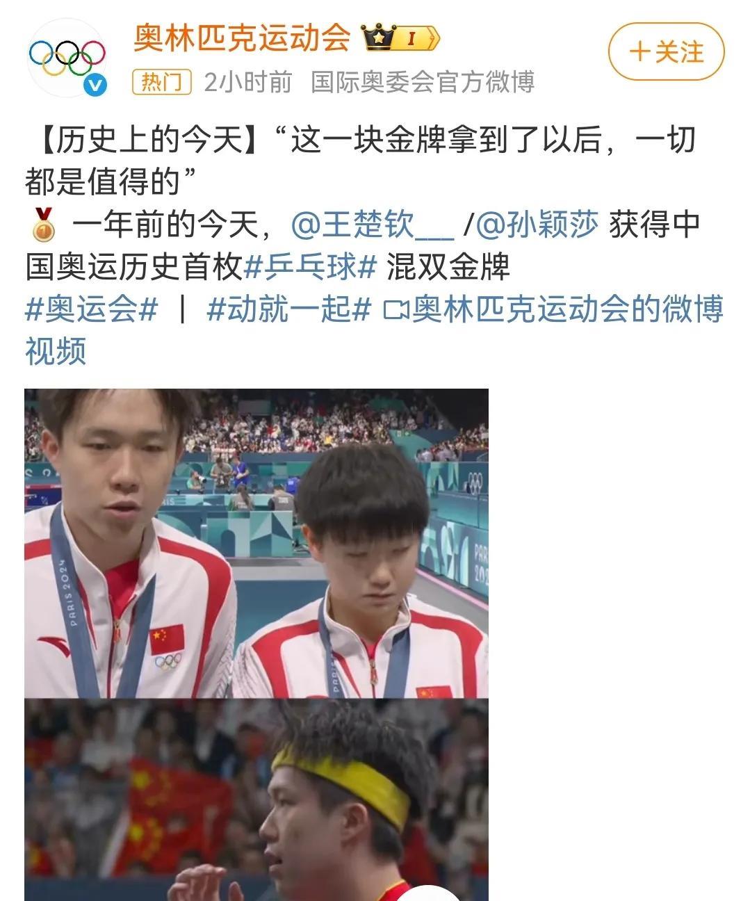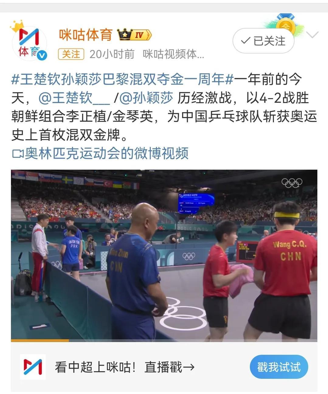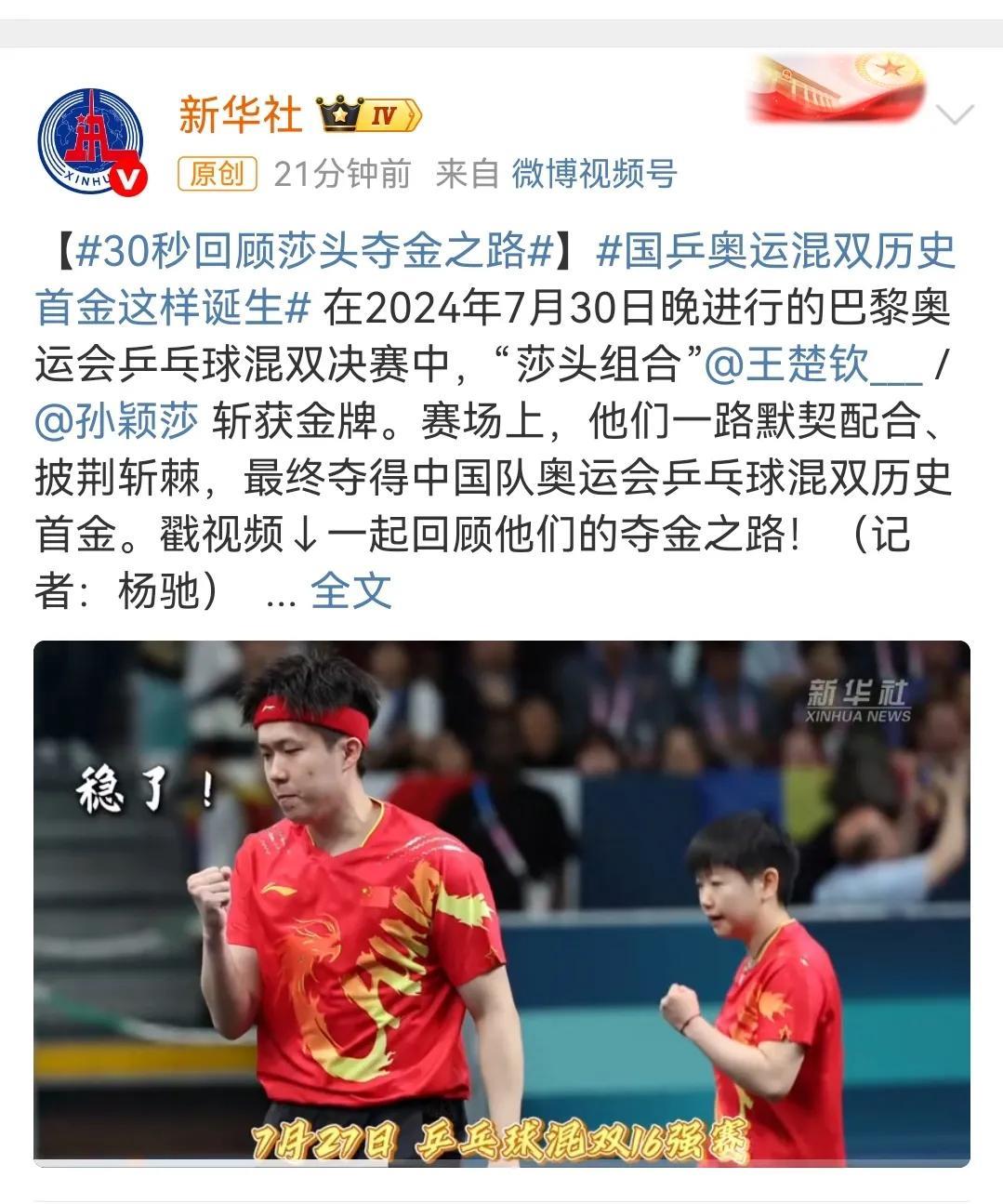 孙颖莎、王楚钦巴黎奥运混双夺冠一周年,和央妈一起重温巴黎奥运会混双决赛。 回看巴黎奥运混双决赛,会发现其实双方选手都很紧张,只是孙颖莎的控场能力更强,第一局中国队在自己的发球轮拿了两分,朝鲜队在自己的发球轮一分未得。 对于中国混双组合来说,对朝鲜组合的打球风格一无所知,所以朝鲜组合才有了神秘之师的说法。 第一局朝鲜组合女选手金琴英率先发球,孙颖莎接发球,朝鲜男选手李正直挑打失误,中国队率先拿下第一分,第二分来自王楚钦的反手推挑得分,孙颖莎的第一个发球轮,王楚钦回球撞网,朝鲜队拿下第一分,莎莎的第二个发球王楚钦回球出台双方打成2:2,其实这一个球王楚钦也是一个回头望月的姿势,就是落点有误差,要不然这一球早就名声大振了,朝鲜队发球轮,朝鲜队男选手李正直发球,孙颖莎一个抢攻小三角拿下一分,第四分来自金琴英接王楚钦回球撞网,王楚钦的发球轮金琴英一个回球出台,另外一个回球撞网,比分来到6:2,金琴英的发球轮,李正直发抢拿下一分,王楚钦接发球拿下一分,比4分来到7:3,孙颖莎的发球轮,王楚钦回球出台丢了一分,莎莎回球弹网带出台再丢一分,比分来到7:5,李正直发球,第一分王楚钦接发球抢攻得分,第二分金琴英失误回球出台,再丢一分,王楚钦的发球轮,金琴英和孙颖莎一人一人一个回球出台,金琴英的发球轮,她自己回球也能撞网,中国混双组合率先拿下第一局11:5. 第一局大家彼此试探阶段,第二局的发球轮大家得分情况大有好转,第二局中国混双组合在自己的五个发球轮一共拿了六分,朝鲜队四个发球轮拿了7分,7:7后朝鲜队李正直发球,王楚钦吃发球,孙颖莎连续回球出台,王楚钦回球撞网,朝鲜队连得四分11:7扳回一局。 第三局中国混双组合在自己的4.5个发球轮拿下五分,朝鲜队在自己的五个发球拿了4分,大比分2:1中国混双组合加油! 第四局中国混双打了一个3:1的开局到7:2,这么领先的一局8:5孙颖莎还拿到一个滚网运气球11:5中国混双组合再拿一局,大比分来到3:1。 第五局从开始到局末都是朝鲜队领先,11:7朝鲜队再下一局大比分来到2:3。 第六局5:5之前,双方轮流得分,5:5后比分一度被追到8:8,9:8是一个非常精彩的球,王楚钦从台下把球捞起来,对方回球后孙颖莎看到对方的右半区无人看守,孙颖莎随意又补了一个直线,王楚钦给孙颖莎竖起了大拇指,恭喜中国混双4:2战胜朝鲜组合。 人民网、中国新闻网、人民日报、新华网、新华社等多家主流媒体一起一起回顾巴黎奥运混双首金诞生,时间过去一年,今天回看这场比赛,依然非常激动,也非常感动!感动两位年轻人场上互相鼓励,第四局王楚钦接发球反手拧拉得分,孙颖莎脱口而出“漂亮”,第六局9:8王楚钦从台下捞起来一个球,对方回球孙颖莎看准机会一个直线,王楚钦毫不犹豫的竖起大拇指,这就是莎头组合八年来的默契和互相鼓励,感谢热血的莎头组合守护了国球的荣耀,未来期待更好! #晒图笔记大赛#