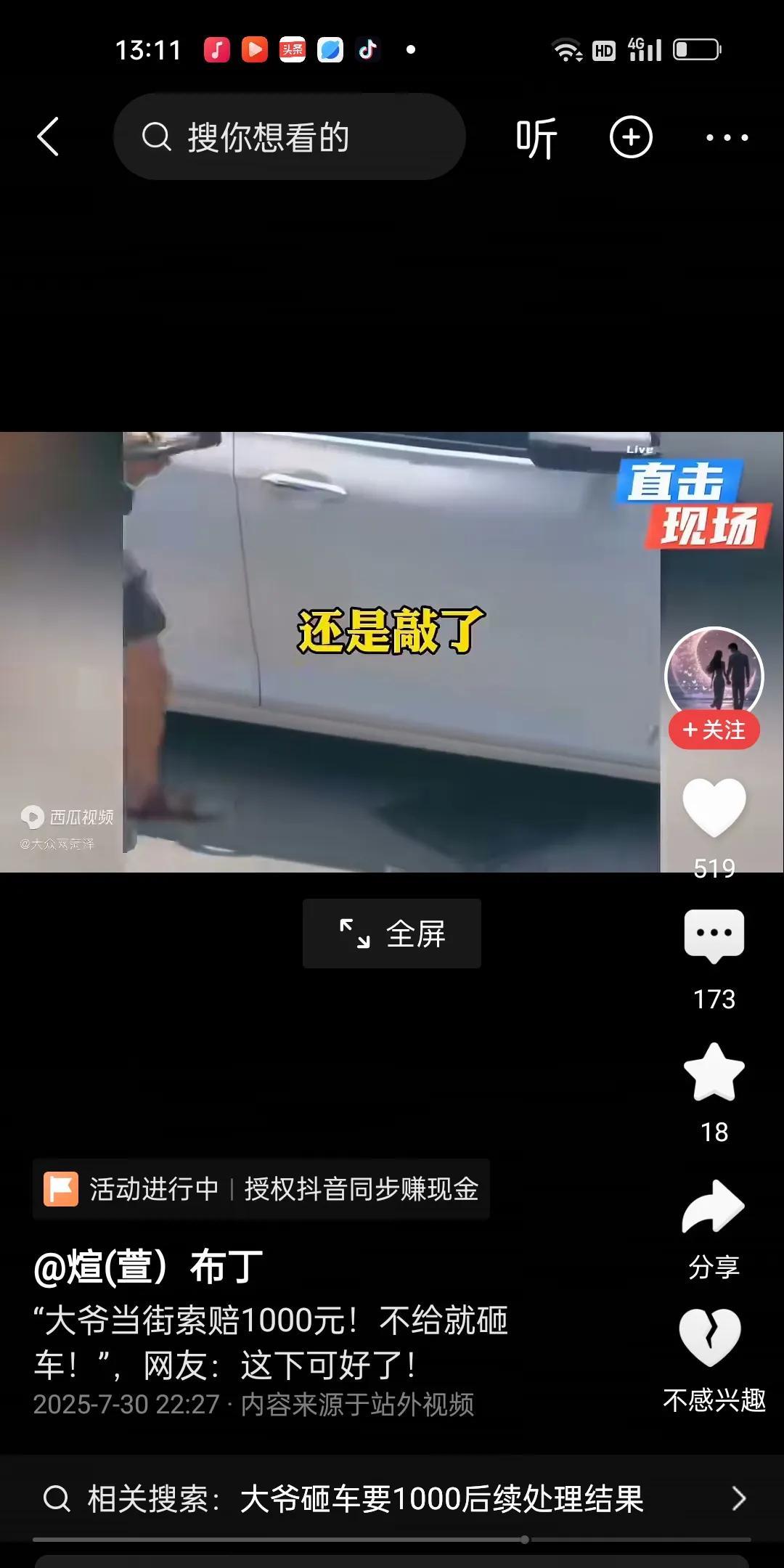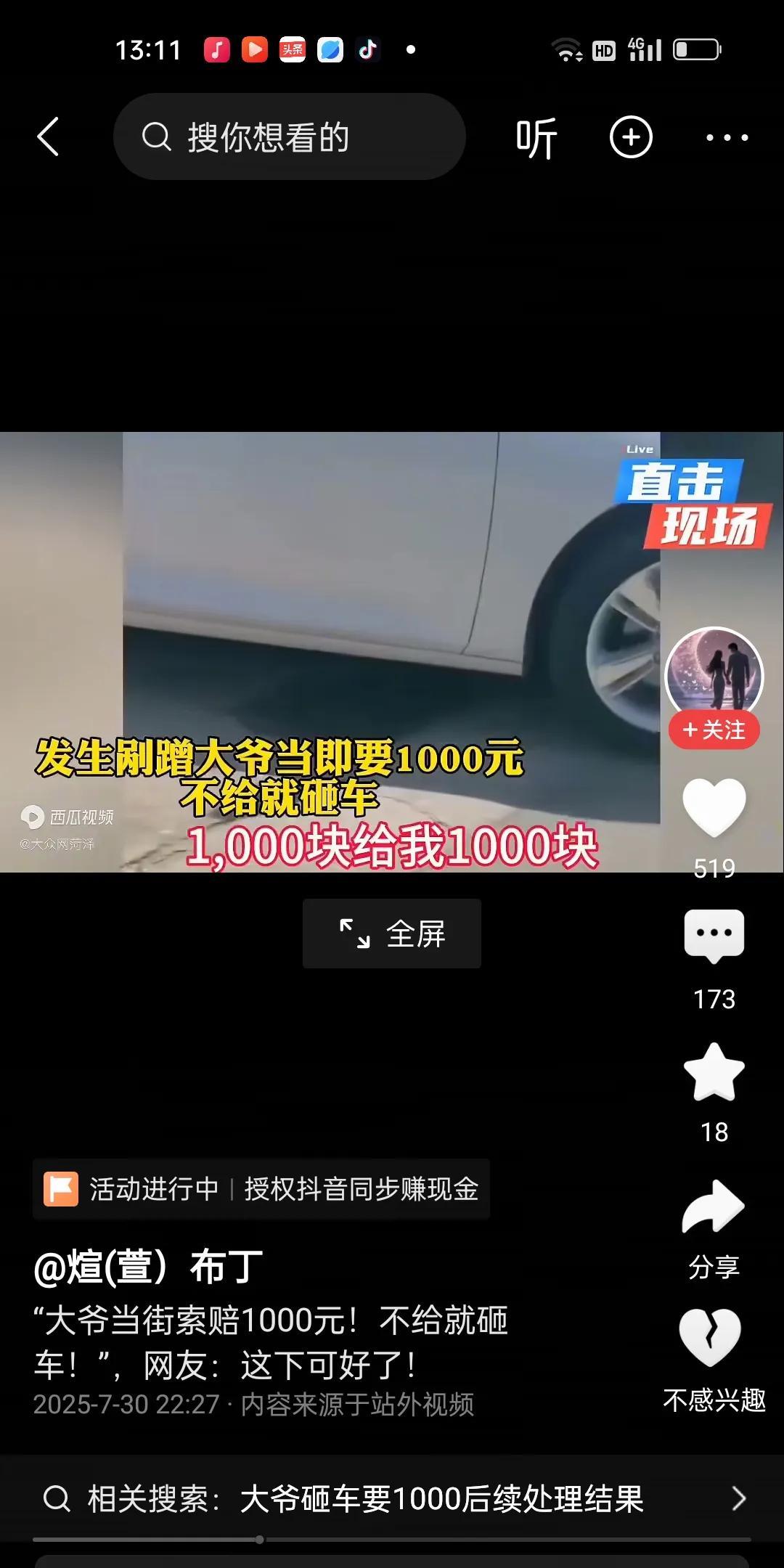 大爷和小车发生剐蹭。大爷拿出铁棍威胁司机赶紧给自己转钱。不转钱就要砸车。司机问你要多少钱?1000块,大爷脱口而出。大爷让司机马上转,并做出砸车的姿势。司机叫他等一等,说保险工作人员马上就到。大爷等不及了,挥起铁棍就砸车。这是坏人变老了,为了钱,已经无法无天了。法律会教他怎么做人的。