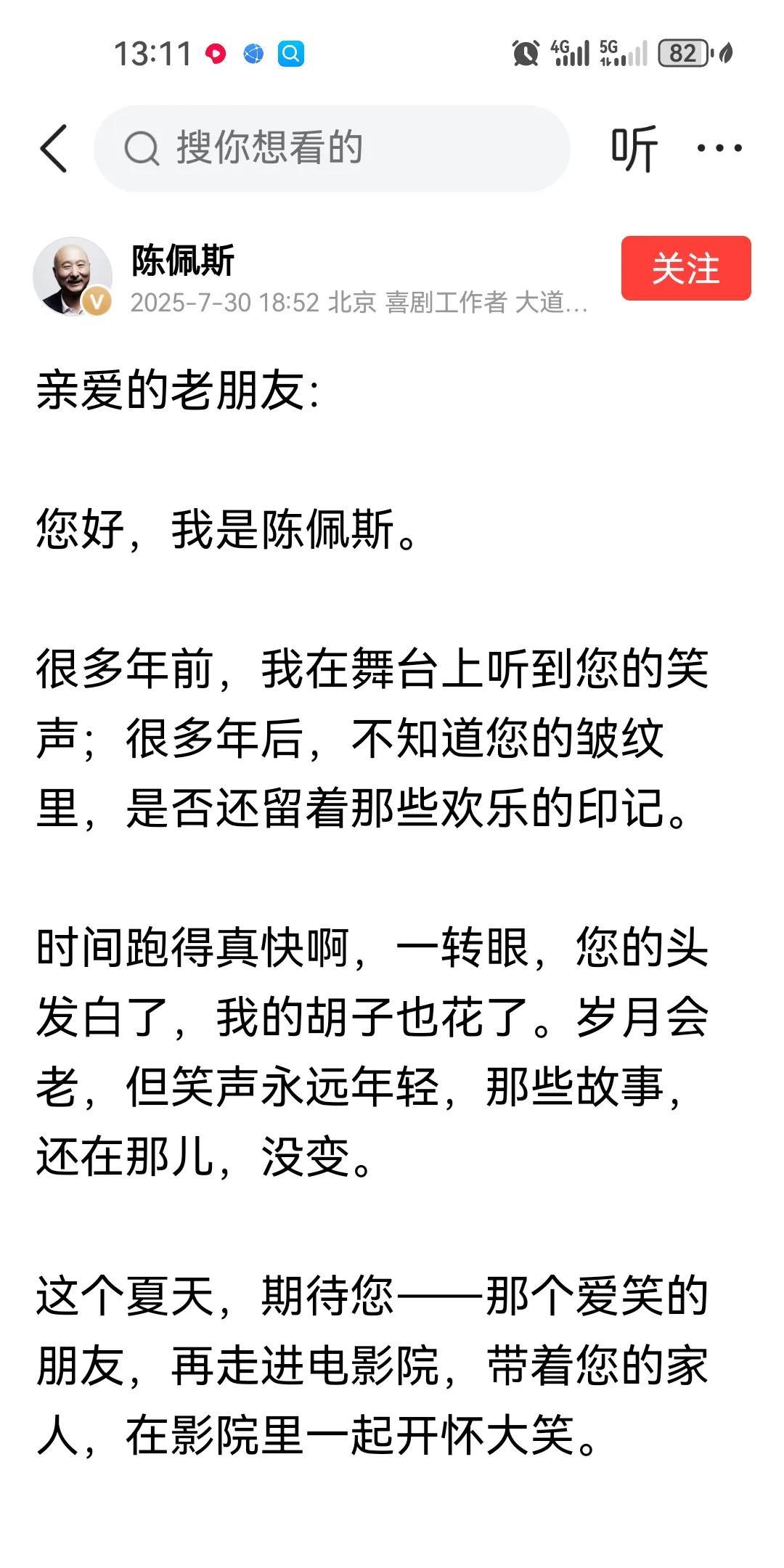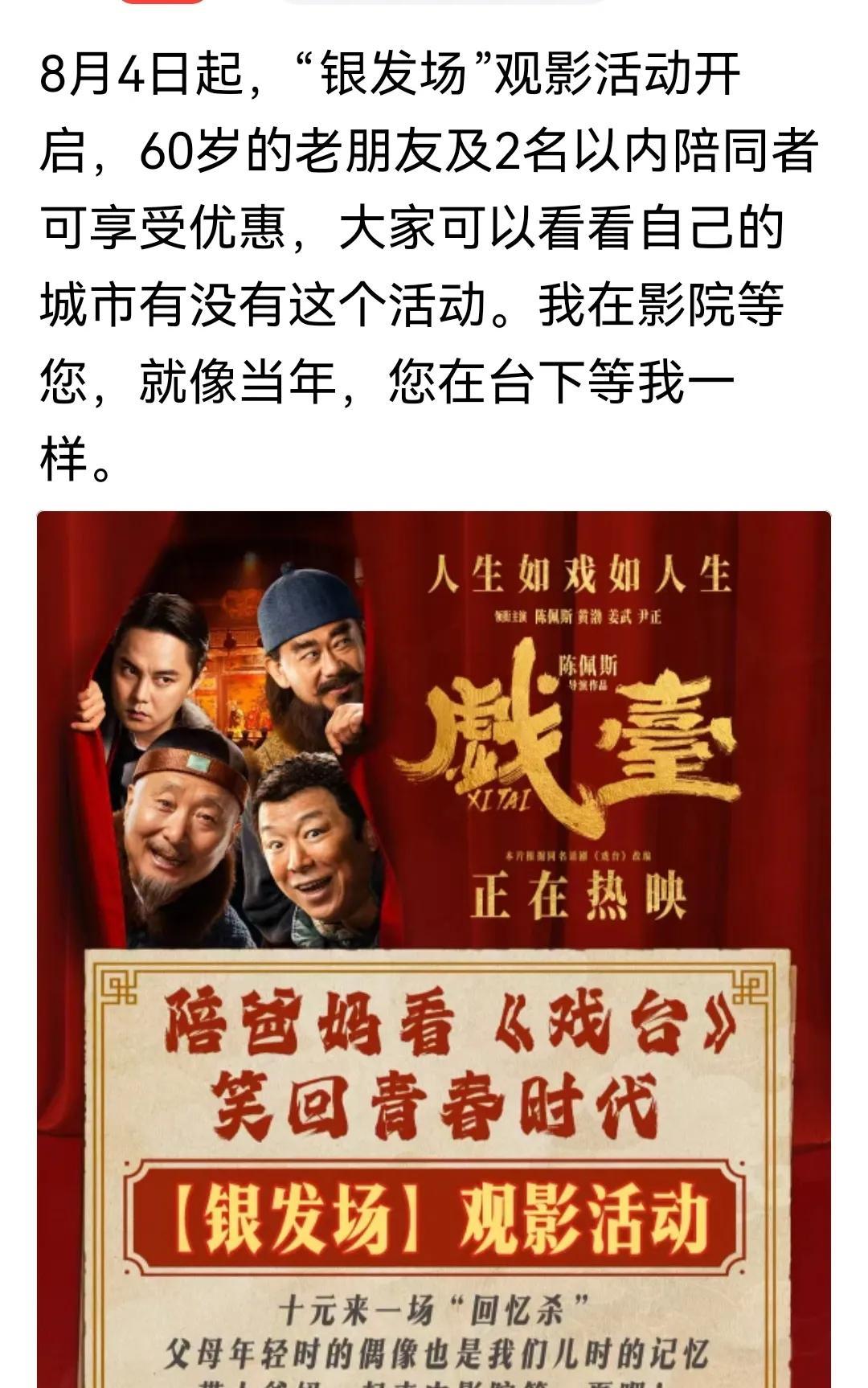 “银发场”观影活动,真的被陈佩斯老师感动到破防了,一名古稀之年的老人自导自演的一部电影,为了让更多的普通老百姓可以看到独属于陈佩斯老师的风趣幽默,还特意给60以上的老人来了一波福利观影活动。 8月4日起,每天上午10点场,线下购票优惠价格10元,60岁以上及2名以内陪同者,不得不说老爷子考虑得真周到,连陪同观影的家属都考虑进去了。 很多年前,我在舞台上听到您的笑声;很多年后,不知道您的皱纹里,是否还留着那些快乐的印记。 时间跑得真快,一转眼您的头发白了,我的胡子也花了,岁月会老,但笑声永远年轻,那些故事,还在那儿,没变。 这个夏天,期待您—那个爱笑的朋友,再走进电影院,带着您的家人,在电影院里一起开怀大笑。 真的,感觉陈佩斯老师说这些话,真的就像跟一个老朋友在唠家常的感觉,唉!您有空吗?要不这个周末咱们一起相约电影院,去看看那个可爱的老头,和他的新作《戏台》。 #晒图笔记大赛#
