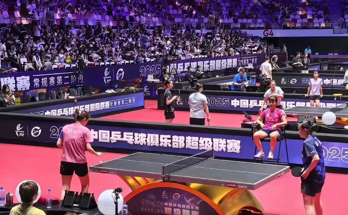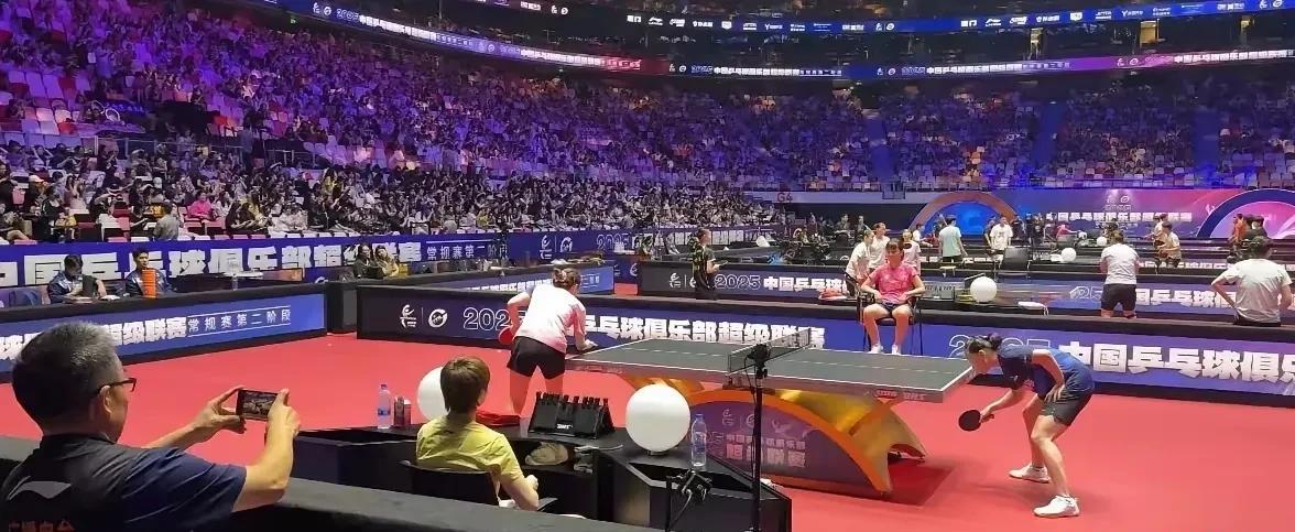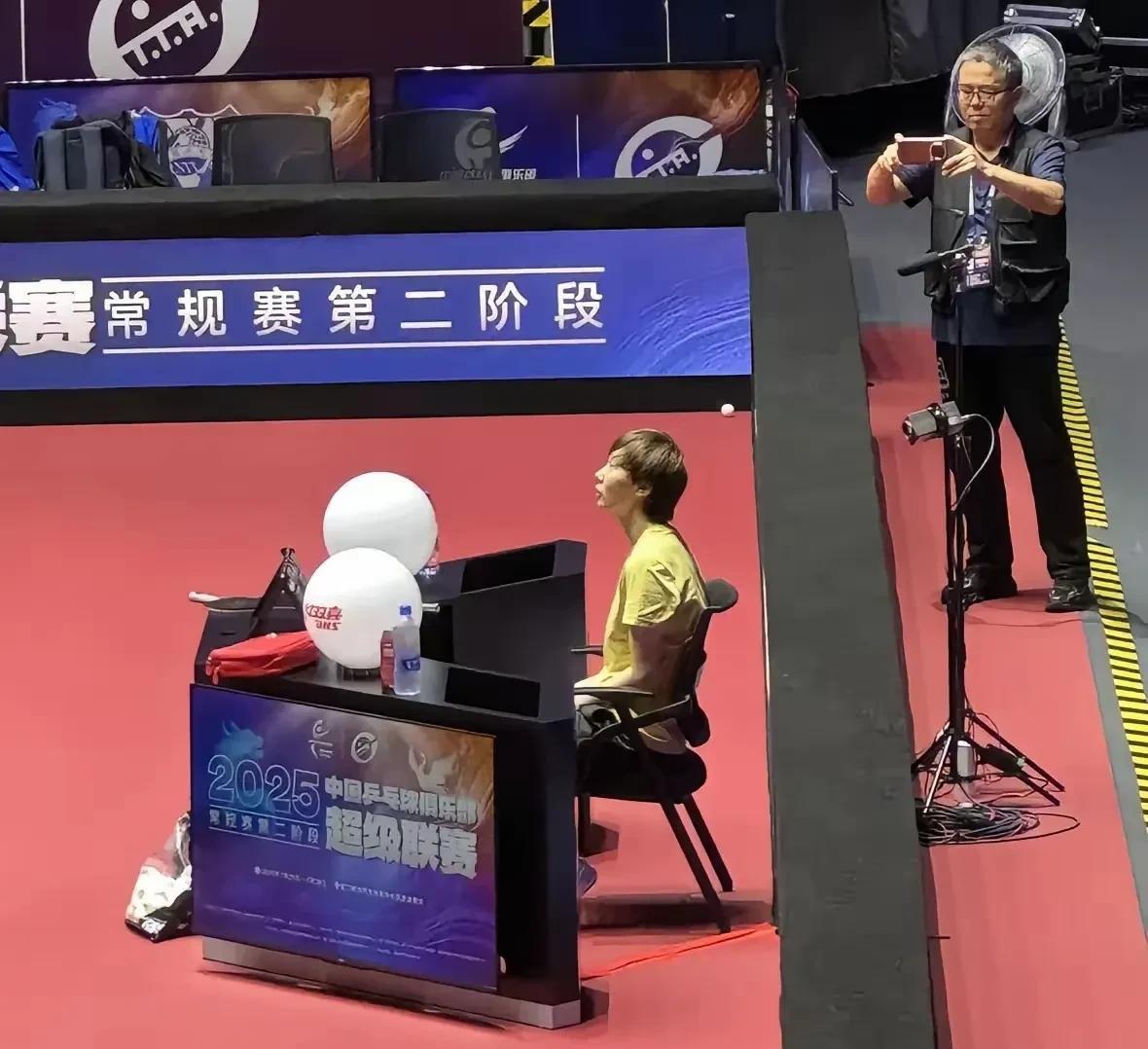 王曼昱端坐主裁判位置,她有了第二身份? 再看看副裁判位置, 坐着的居然是陈幸同, 她还负责给场上的球员扔球。 有观众,有球员,有主副裁判。 哪里不对? 场上打球的居然是徐奕和钱天一! 他们可都是鲁能队的, 不可能在乒超相遇, 那一定是鲁能队打完比赛以后, 利用球桌练球了。 不过鳗鱼往那一坐, 有了主裁判的气势[呲牙]