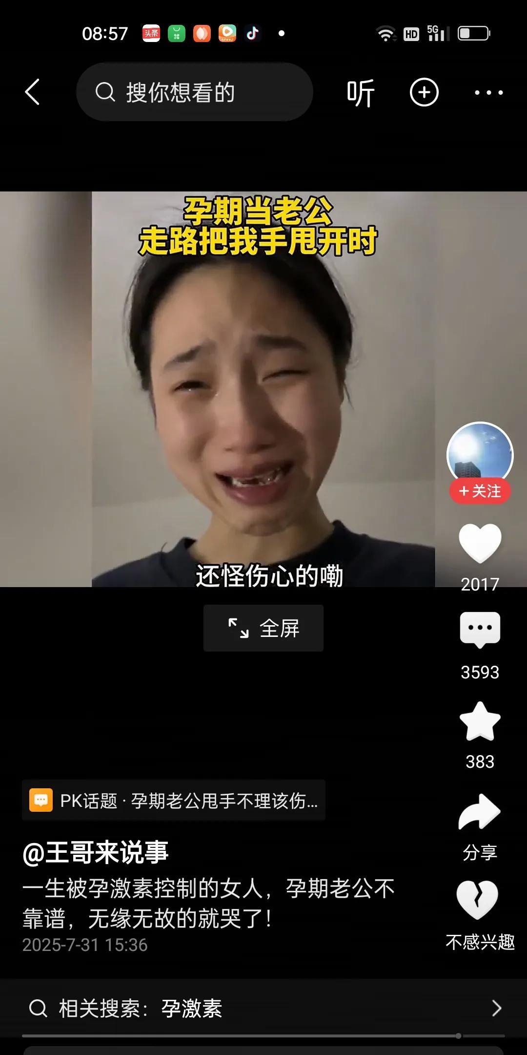 孕期女子被老公甩开手后,有点情绪崩溃。她一边抹眼泪,一边很伤心地哭着说,你把我的手甩开了。你吃饭的时候没有和我说话,还怪伤心的了。男子解释,我一天都很忙的了。女子继续对男人抱怨,那面部表情都有点变傻了,难怪说一孕傻三年。
