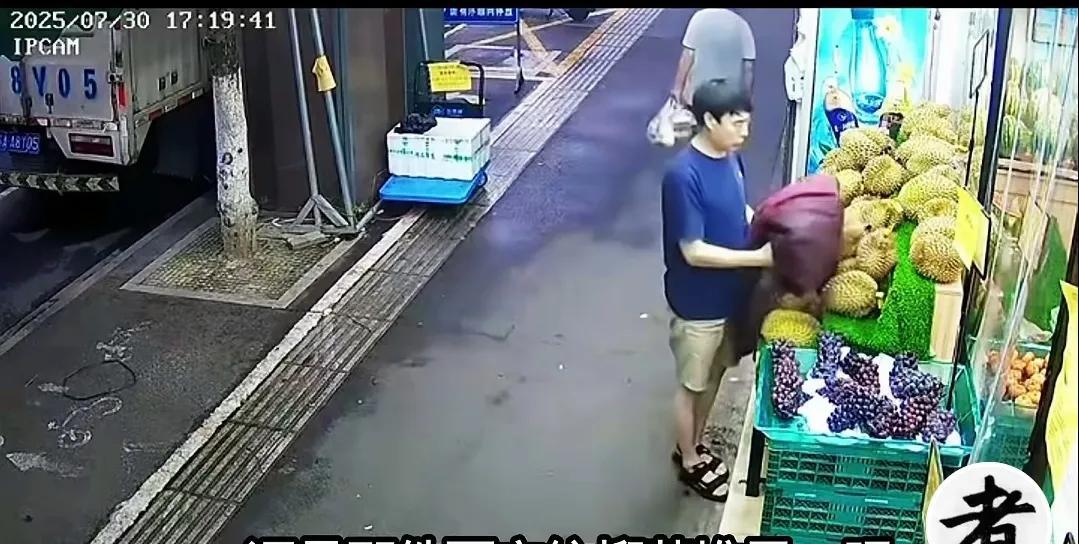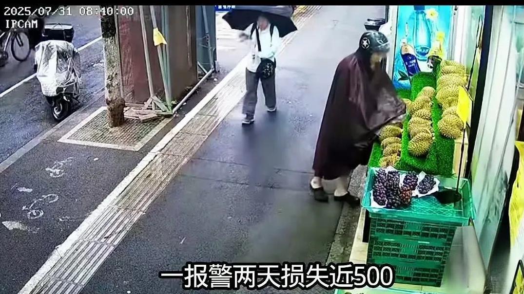 事发江苏南京7月30-31日,一水果店连续两天遭遇同一个人,以相同的方式偷走榴莲。 榴莲是价格比较贵的水果,买得起可以多吃,买不起可以少吃,不吃也是没有问题的,毕竟水果又不是主食,但是有那么一种人,不是买得起或者买不起的问题就是惯偷。 江苏南京这家水果店地理位置就在马路边上,7月30日傍晚17:19分,一年轻男子径直走向水果店榴莲位置,将手中折叠的雨衣盖在榴莲上,抱起一只榴莲就离开了,动作非常娴熟,没有没有丝毫紧张的感觉,水果店老板轻点榴莲数量的时候以为自己记错了。 第二他上午八点四十分,前一天在水果店偷走一只榴莲的这名男子又来了,当时外面正下着雨,这名男子走到水果店摆放榴莲的位置,撩起雨衣再次抱走一只榴莲放在自己的电动踏板车上,非常自然的扬长而去,不知道这家水果店老板把视频发到网上后,这位连续两场作案的年轻男子现在在哪里凉快! #晒图笔记大赛#