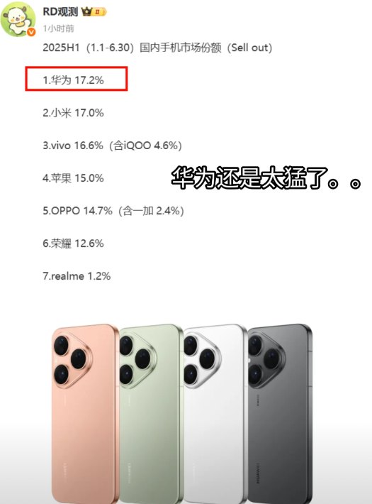 不是说华为销量不咋地嘛,这不打脸了... 一个个都在说自己销量多强多强的,结果一看总的就麻了,2025上半年国内市场还是华为第一,这扯不扯的。 而且苹果居然排到第四去了,最近iPhone 16 Pro和Pro Max不是卖得挺好的吗? 上半年华为都这样了,下半年Mate80系列一出不是更夸张?
