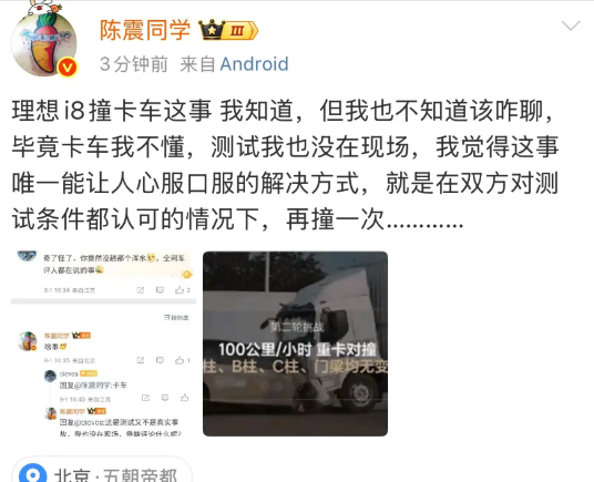 陈震谈理想撞卡车:“我觉得这事唯一能让人心服口服的解决方式,就是在双方对测试条件都认可的情况下,再撞一次!”